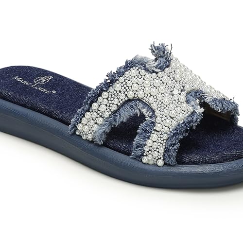 Marc Loire Women Embellished Denim Casual Flats | Slip-On Open Toe Chappals | Indian Smart Sandals with Comfortable Sole (Blue, UK Footwear Size System, Adult, Women, Numeric, Medium, 4)
