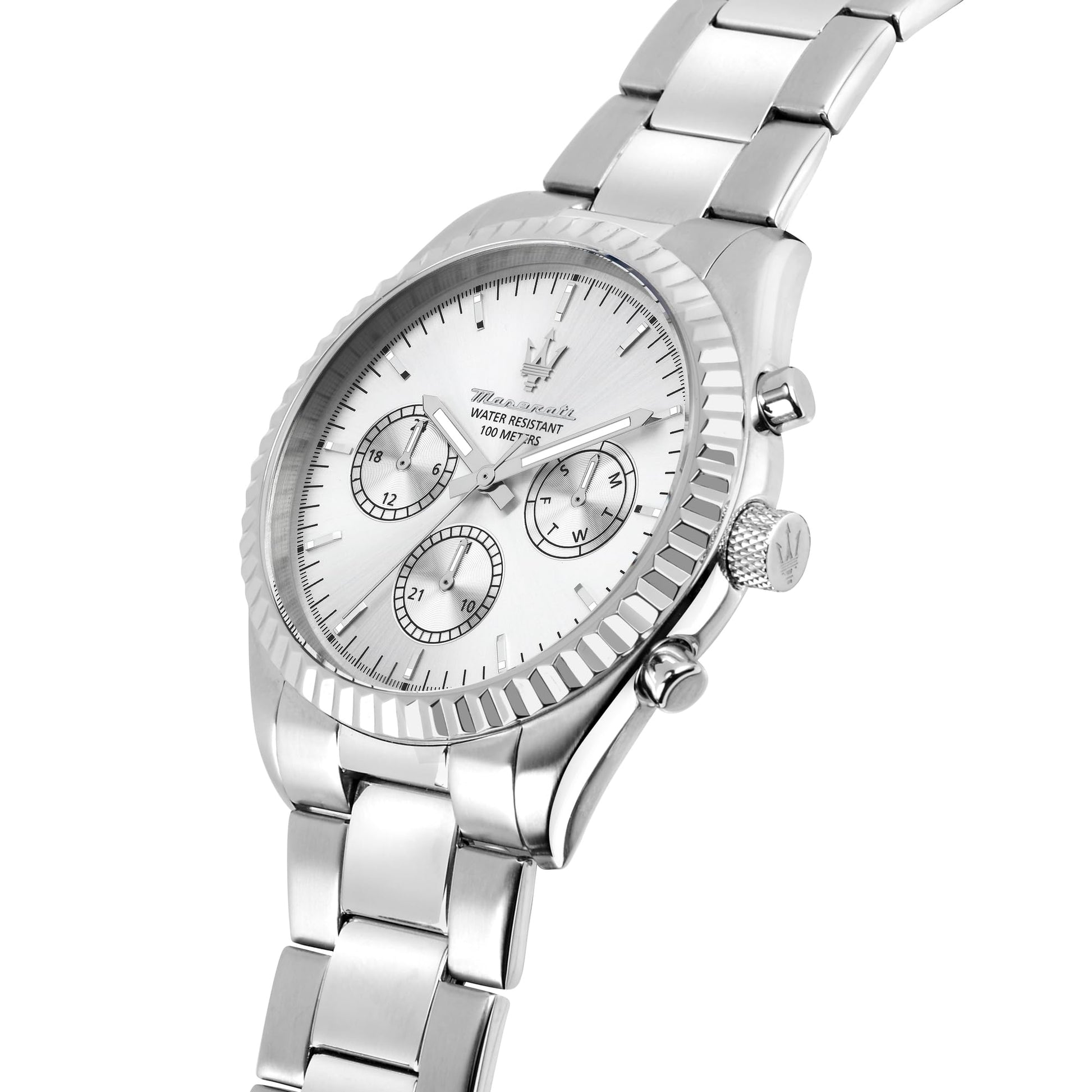 Maserati Men's Watch, ref. R8853100041, COMPETIZIONE Collection, in steel, quartz movement, multifunction function. The watch features a steel strap, with a hidden clasp. The watch case measures 43mm, surrounds a silver dial and mounts a resistant mineral glass. Water resistance up to 10 ATM. The watch is contained in its original packaging, with a 2-year warranty certificate.