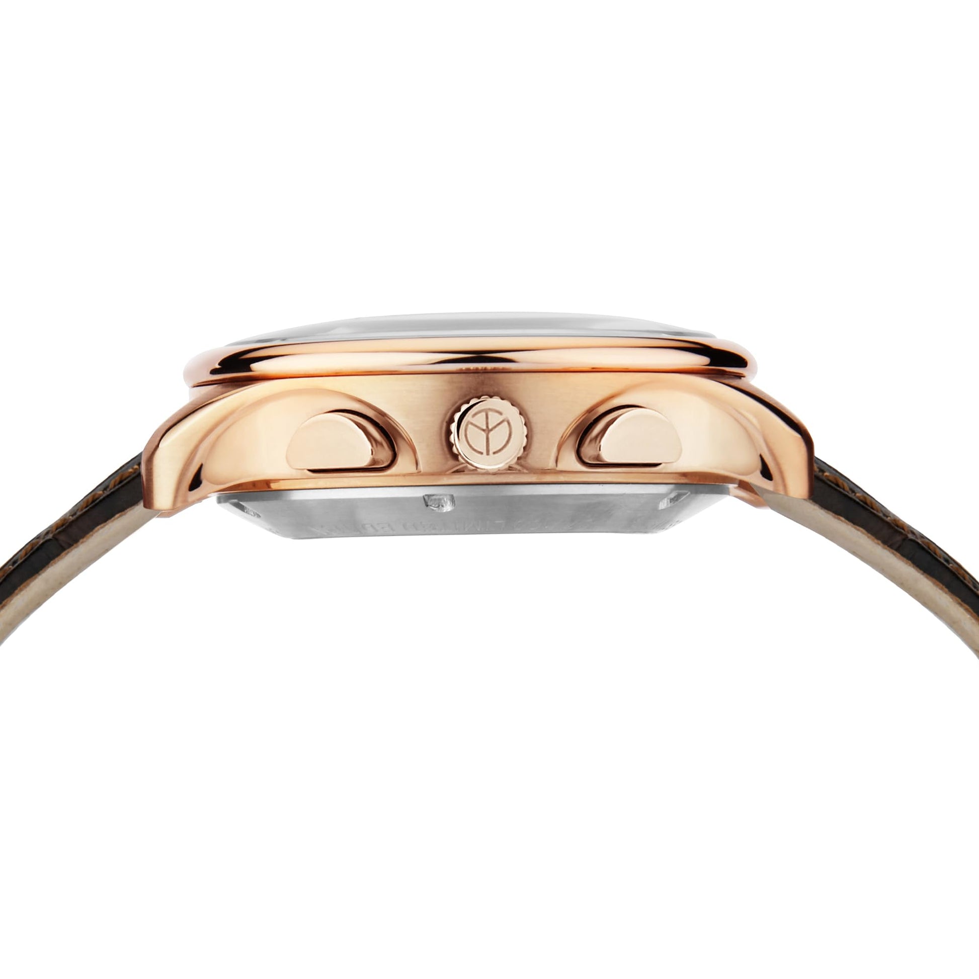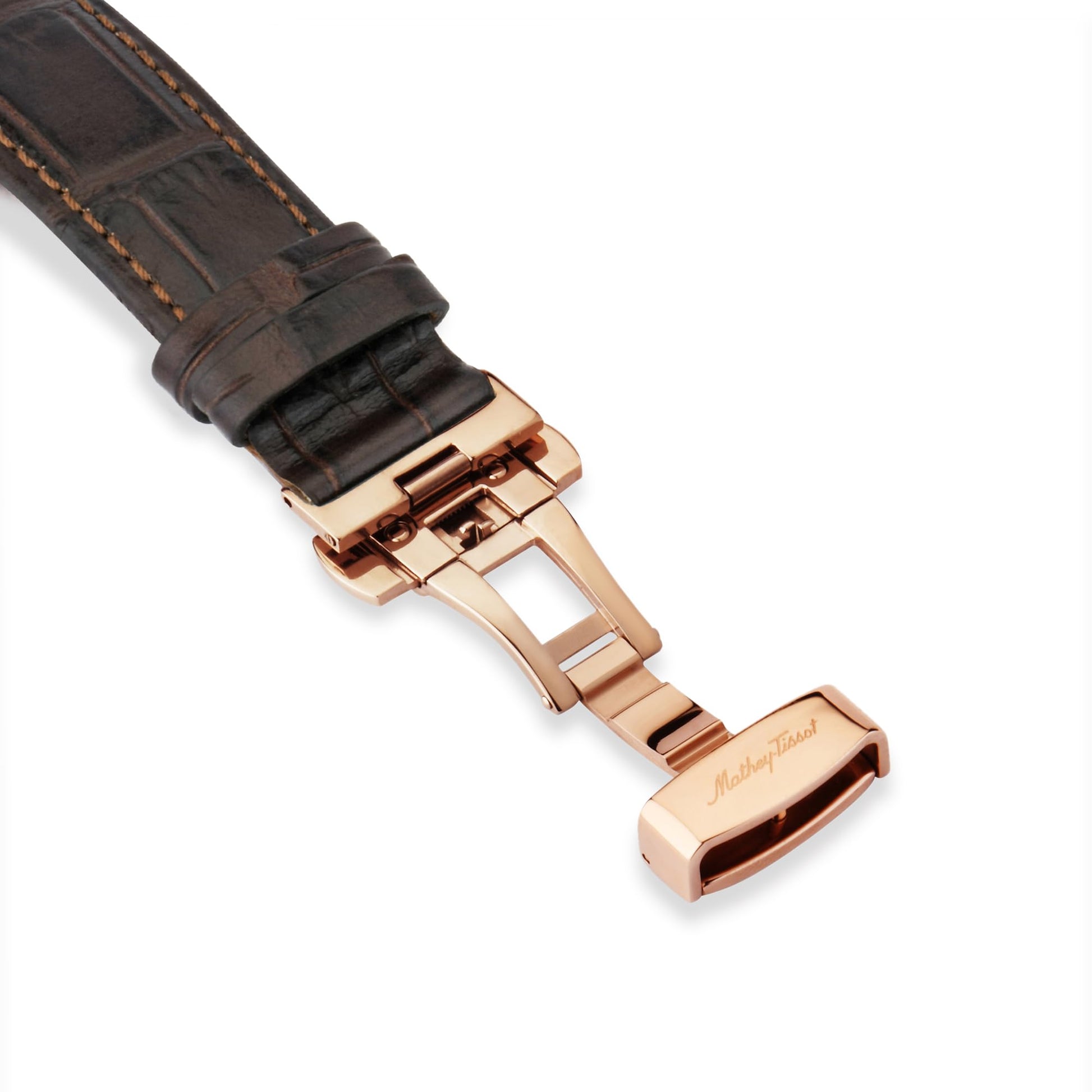 Rose gold PVD stainless steel case with a brown leather strap. Fixed rose gold PVD bezel. White dial with blue hands and index hour markers. Arabic numerals appear at the 3, 6, 9 and 12 o'clock positions. Minute markers around the outer rim. Dial Type: Analog. Day of the week and date display at the 3 o'clock position. Chronograph - two sub-dials displaying: 30 minutes and 12 hours. Landeron 77 automatic movement. Scratch resistant mineral crystal. Pull / push crown. Transparent case back. Round case shape. Case size: 42 mm. Case thickness: 13 mm. Band width: 20 mm. Butterfly clasp. Water resistant at 50 meters / 165 feet. Functions: chronograph, day, date, hour, minute, second. Additional Info: dome glass. Edmond Chrono Automatic Series. Casual watch style. Watch label: Swiss Made. Mathey-Tissot Edmond Chrono Automatic Chronograph White Dial Men's Watch H1886CHATPI.