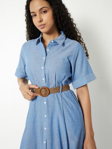 Max Women Solid A-line Shirt Dress with Belt (Blue_L)