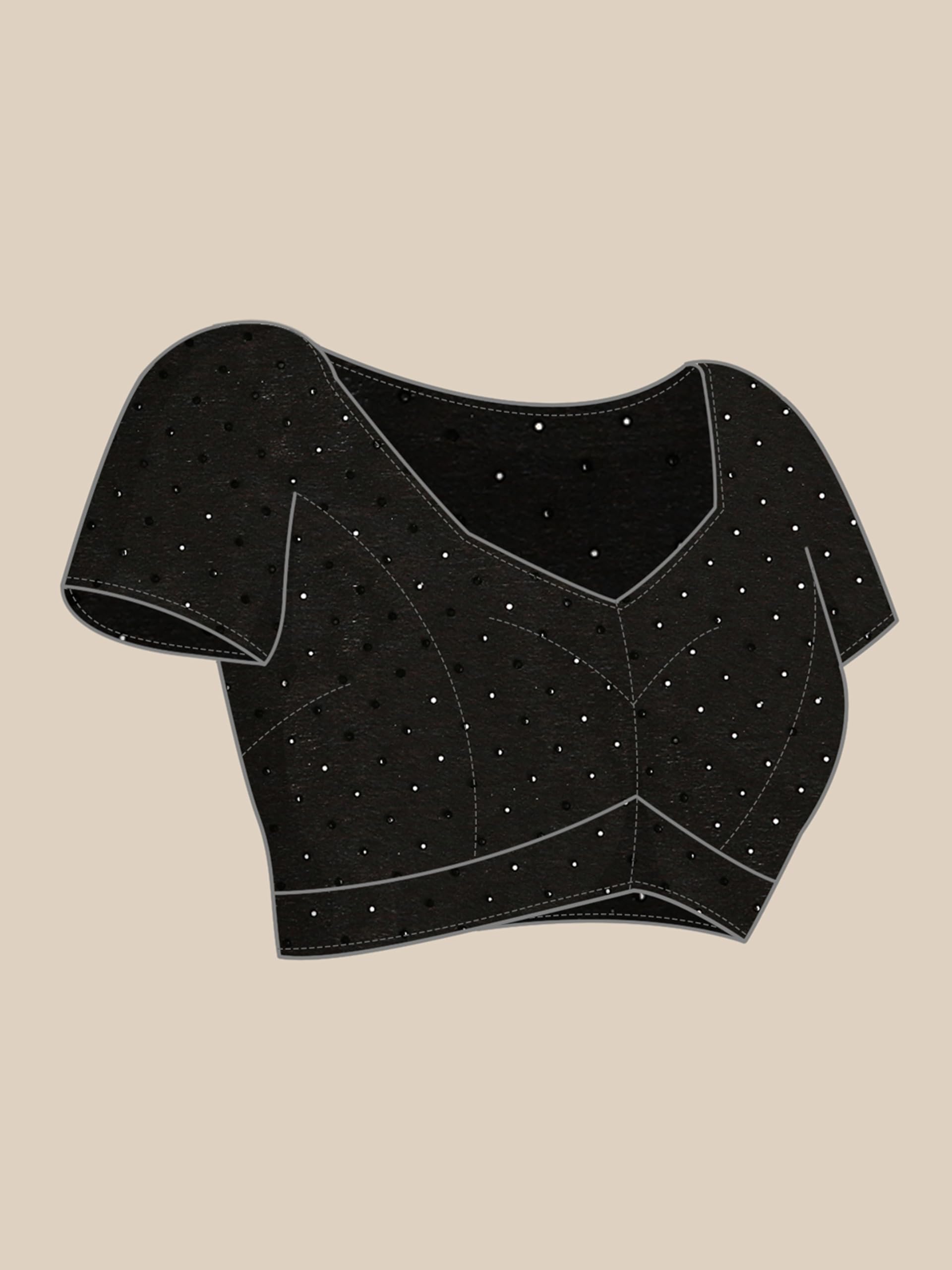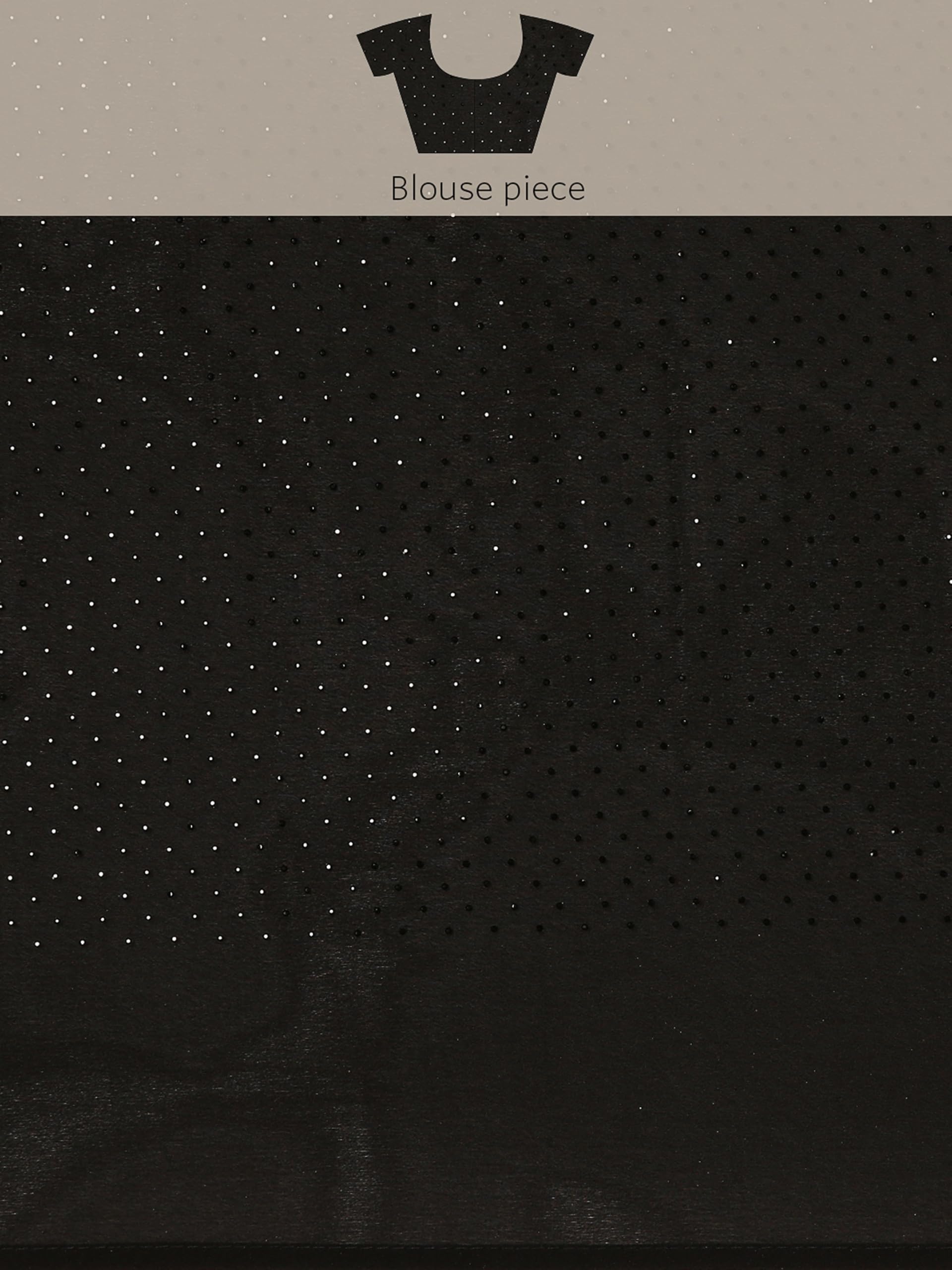 - Design: This elegant Kohl Black Saree is adorned with a detailed Jaal pattern and delicate stone embellishments, providing a shimmering and sophisticated appearance. Its deep black color contrasts strikingly with the glittering embellishments, making it ideal for formal events. To achieve a stylish and unified look, pair it with a high-neck, full-sleeve black blouse and simple silver jewelry, letting the saree's elaborate design shine.