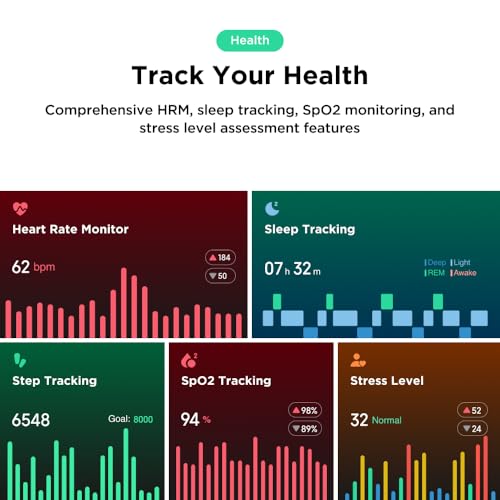 - Advanced Health Monitoring - Stay on top of your health with comprehensive tracking features including heart rate, SpO2, and stress monitoring, providing you with valuable insights to maintain your well-being.