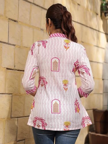 - Size: XL || Color: Pink || Material: Cotton Blend || Style Type: A-line || Length Type: Hip Length || Pattern: Floral Printed || Collar Type: V-Neck || Sleeve Length: 3/4 Sleeves || Package Includes: 1 Top