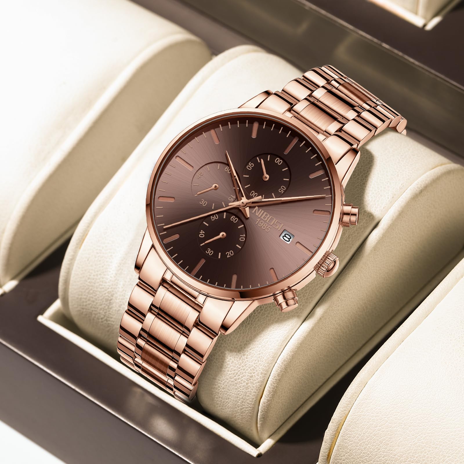 NIBOSI Men's Watches Analog Minimalist Black Dial Watches for Men Business Chronograph Casual Stainless Steel Strap Date (Rose Brown)