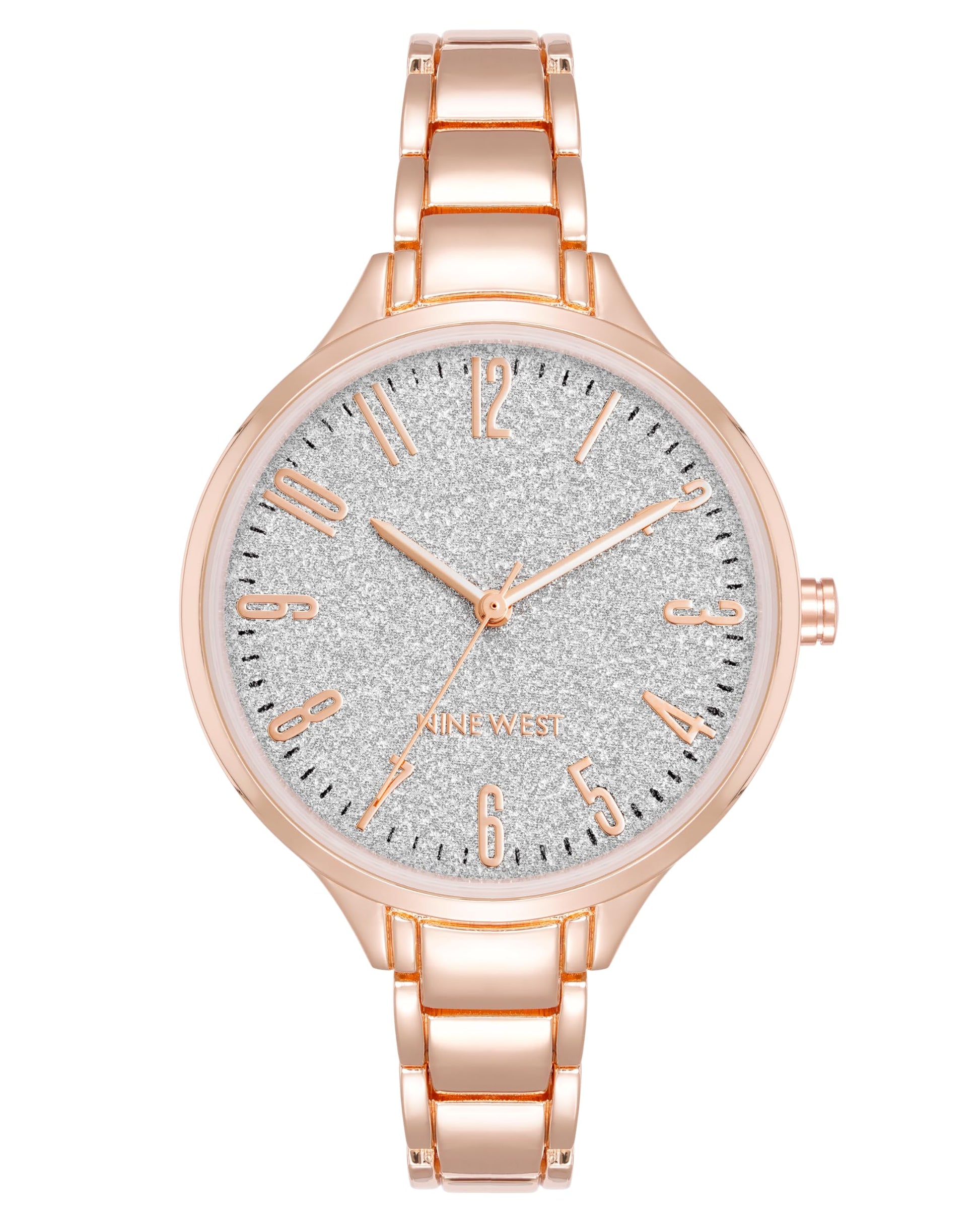 - Rose gold-tone glitter dial with matching hands, markers and black outer minute track