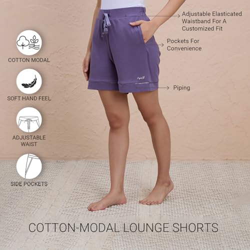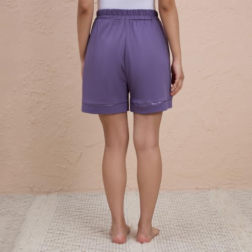 NYKD Buttery Soft Modal Cotton Shorts for Women with Clean Elasticated Waist, Satin Tie & Side Pockets – Comfortable Relaxed Fit, Model NYS928 Purple