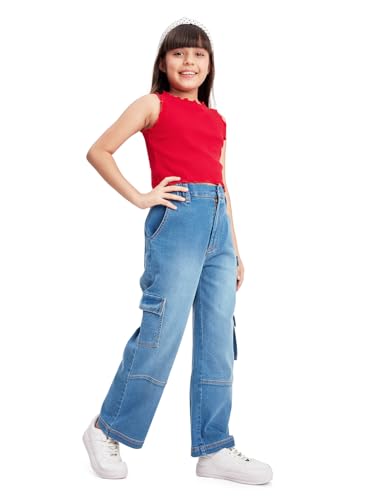 olele® | 7 Pockets Cargo Jeans Pants for Girls| Relaxed Fit Stretchable Denim Jeans Elasticated Waist Pant for 4 to 14 Years Kids