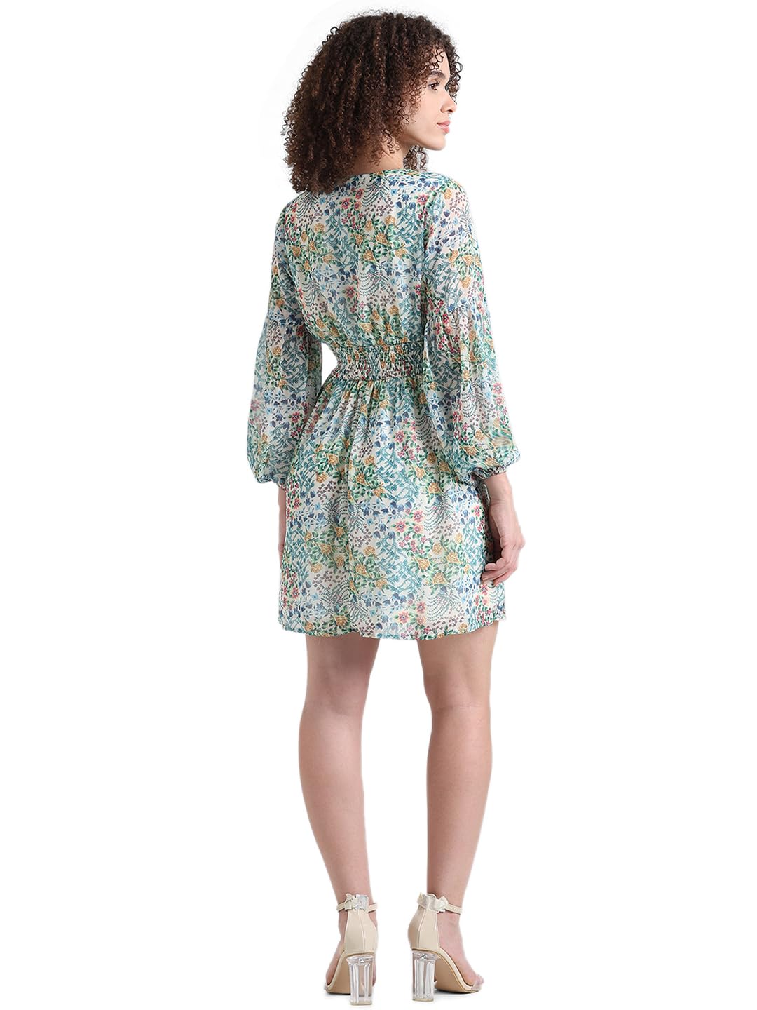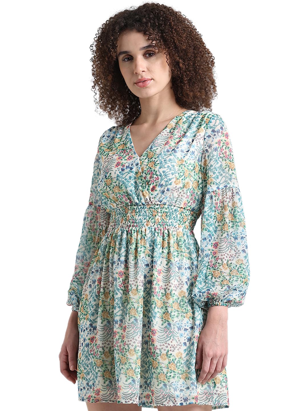 Details: Short dress in Printed chiffon. Deep V-neckline and a wrapover front with wide smoke insert at the waist. Long balloon sleeves with narrow elastication at the cuffs. lined.