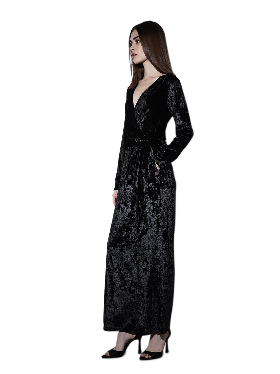 Jumpsuit in a Velour weave with wrapover front. Tie belt at the waist, diagonal side pockets . Zip open at back and Straight legs .