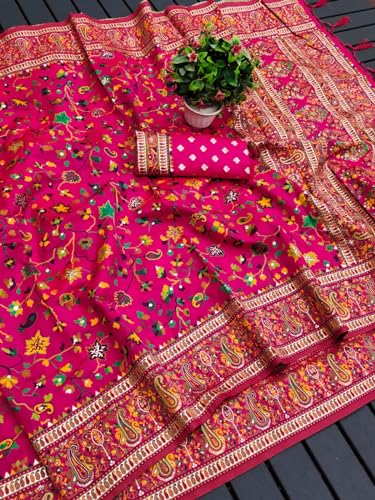 Panzora Woman's Dark Pink Kashmiri Pashmina Silk Saree with Unstitched Blouse Piece.