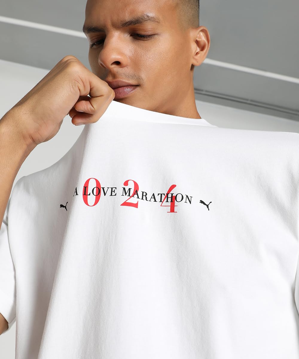 Product Story: Represent the PUMA Love Marathon in this graphic tee. The relaxed-fit tee has short sleeves and a crew neck and features a graphic print on the front and back that commemorate the marathon. DETAILS Relaxed fit Print centred on chest Short sleeves Regular Length Rib Crew Neck Print on back body