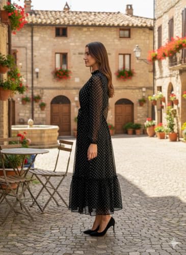 - TIMELESS POLKA DOT DESIGN: Featuring a classic black base with elegant white polka dots, this maxi dress merges vintage charm with modern style. An essential wardrobe piece that never goes out of fashion.