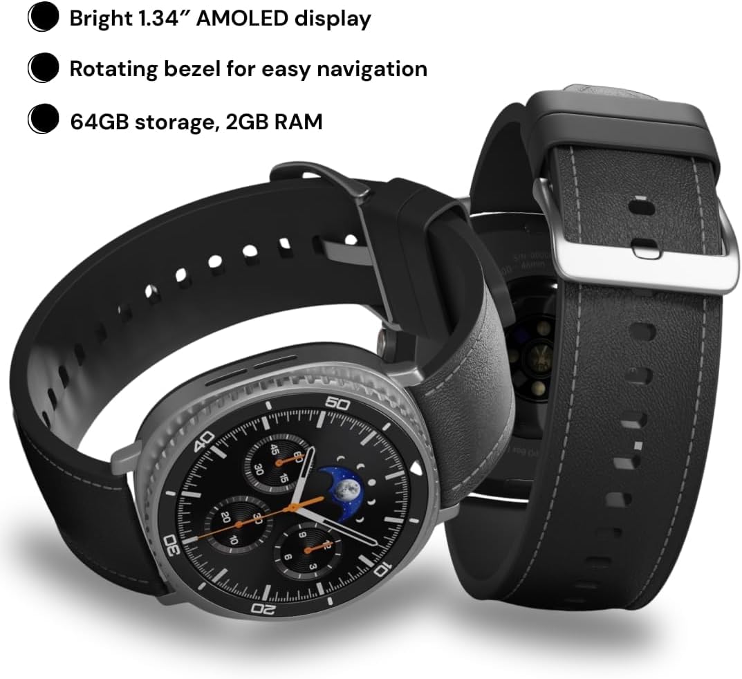 • Elegant Classic Design with Rotating Bezel & Cushion Aesthetic — Featuring a refined 46 mm squircle-style stainless steel body, tactile rotating bezel, Quick Button, and a sapphire-protected Super AMOLED display that reaches up to 3,000 nits for superb outdoor visibility.