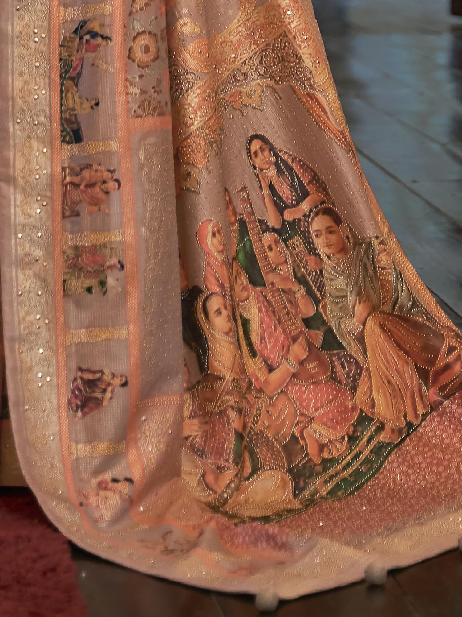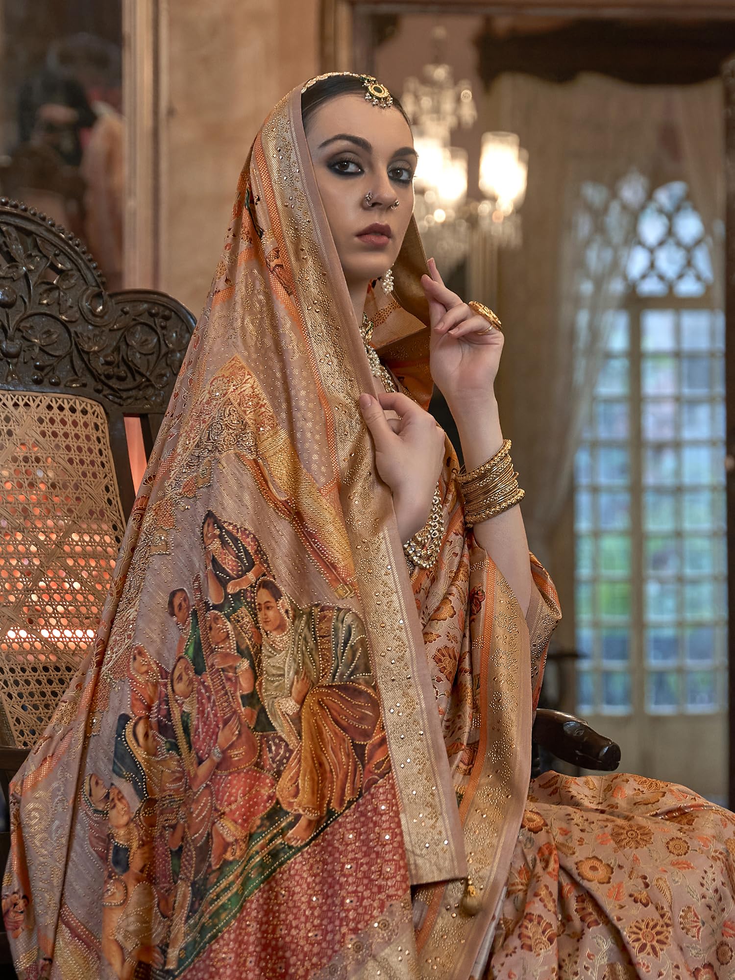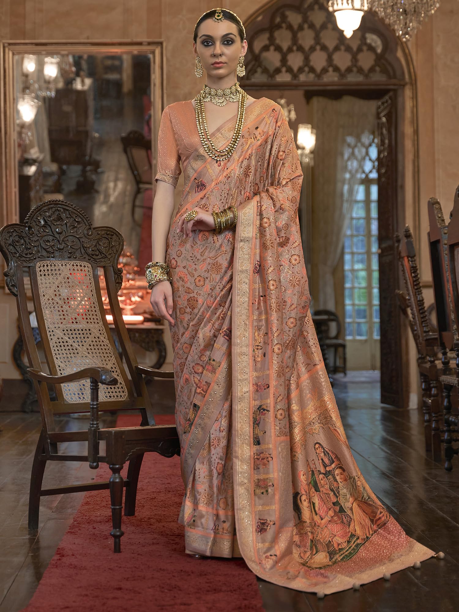 SAREE MALL Women's Botanical Printed Tassels and Latkans Banarasi Silk Saree With Unstiched Blouse Piece (Peach_PDMAVT695_RW)