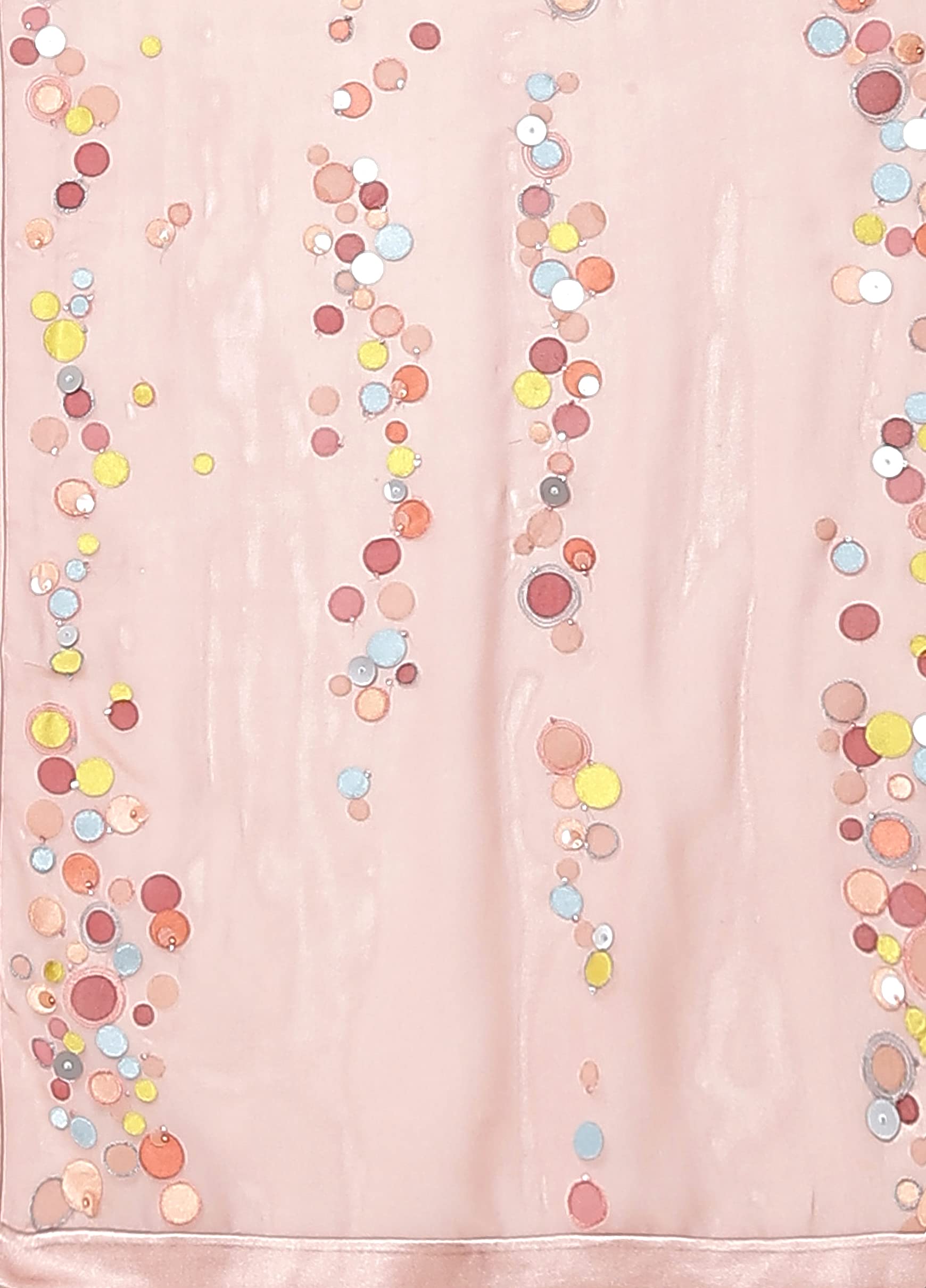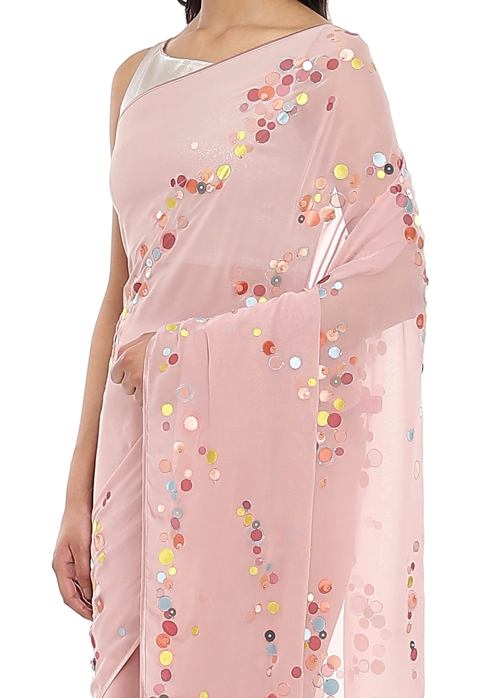 Crafted in silk georgette, this soft peach Iridescent sari with polka dots is made with hand-crafted sequins. It comes paired with an embroidered blouse fabric in modal satin making it perfect occasion wear.