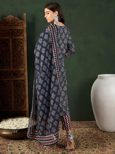 • ✨ Size: S || Color: Blue || Material: Cotton blend || Style Type: Straight || Length Type: Calf Length || Pattern: Printed || Collar Type: V Neck || Sleeve Length: 3/4 Sleeves || Package Contains: 1 Kurta, 1 Pant, 1 Dupatta