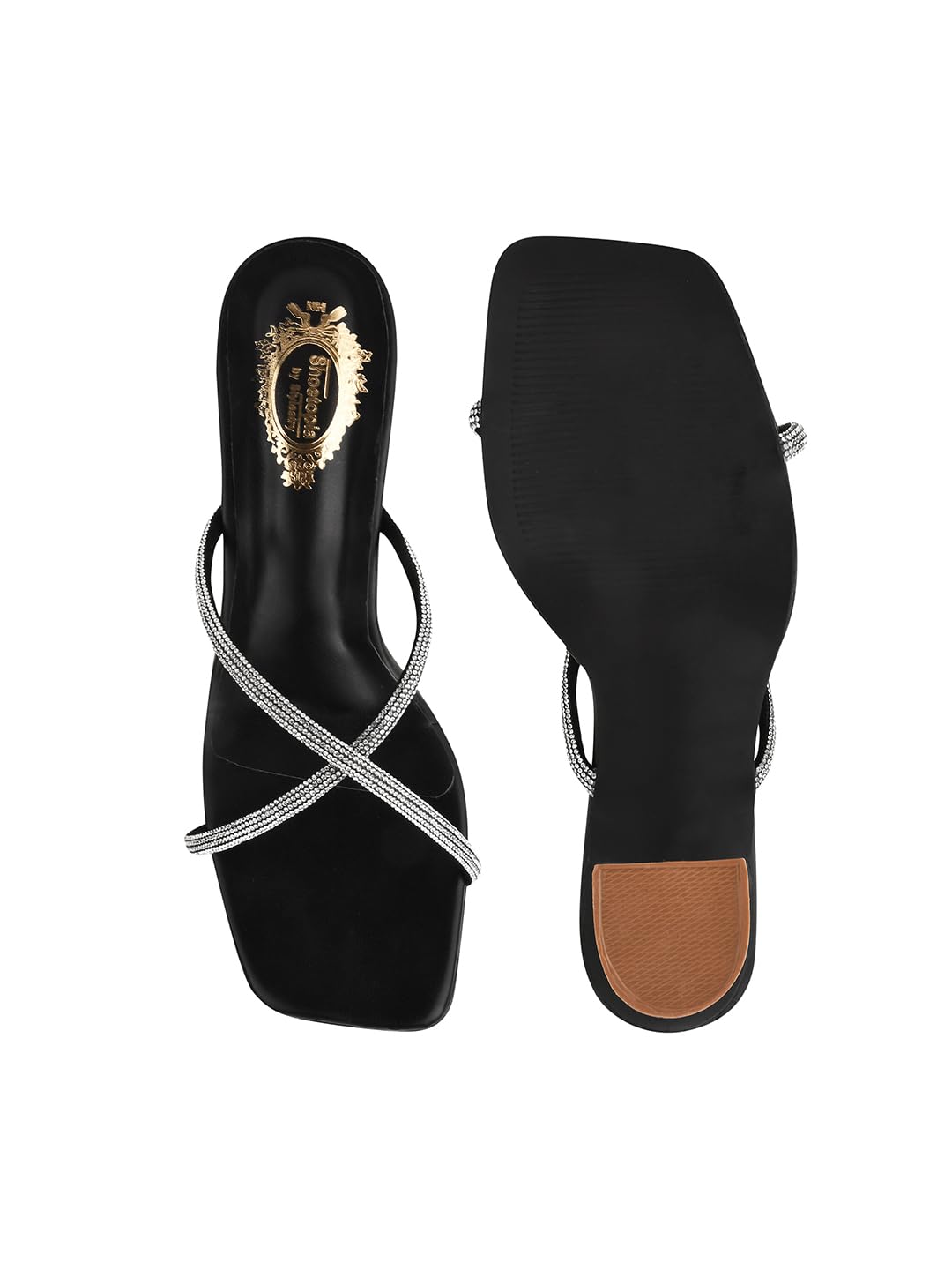 Shoetopia Women’s Rhinestone Strappy Black Heeled Sandals – Square Toe Mule Slides, Sparkly Crystal Thin-Strap Dress Heels with Flared Block Heel – Bridal/Party & Casual Footwear EU37