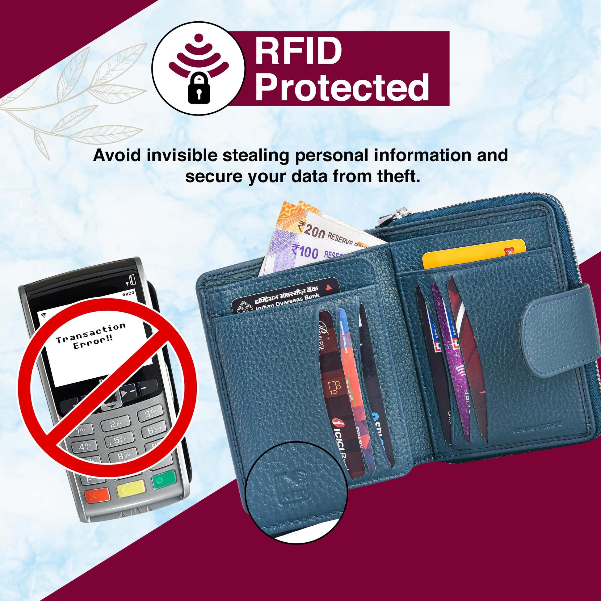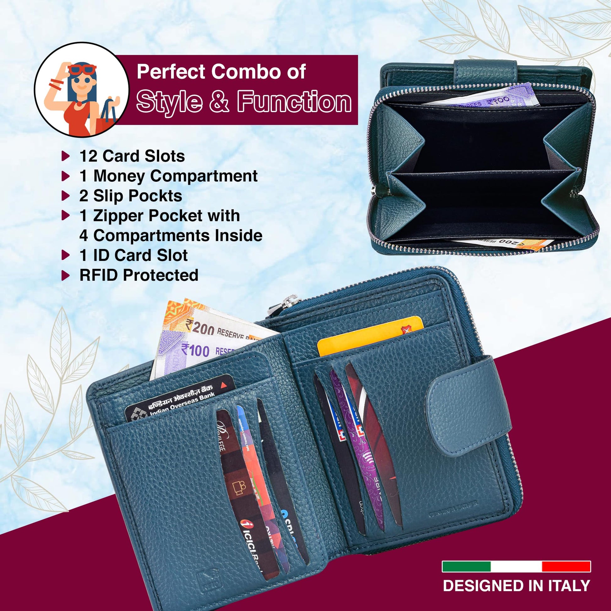 - ๐๐ฒ๐ป๐๐ถ๐ป๐ฒ ๐๐ฒ๐ฎ๐๐ต๐ฒ๐ฟ ๐๐ผ๐ป๐๐๐ฟ๐๐ฐ๐๐ถ๐ผ๐ป: Our leather wallets are made from high-quality, genuine leather, ensuring premium look & feel also durability. The supple texture of the leather not only feels luxurious to the touch but also develops a beautiful patina over time, making each wallet unique to its owner. We understand the importance of style, and our leather wallets for women reflect just that.