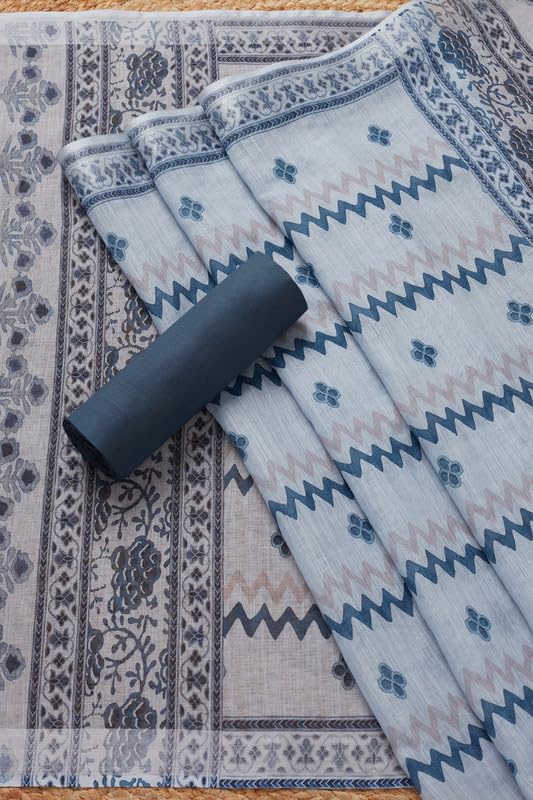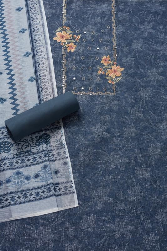Soch Womens Indigo Linen Floral Unstitch Dress Material With Mirror Work