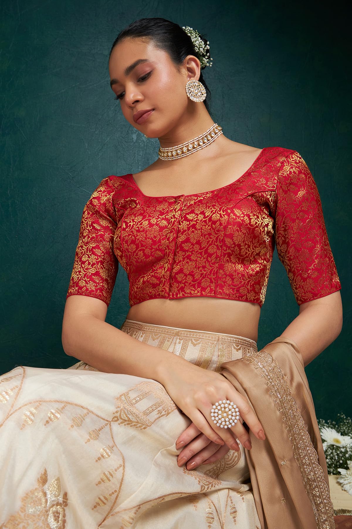 Soch Womens Red Art Silk Half Sleeve Blouse with Woven Floral Designs 38