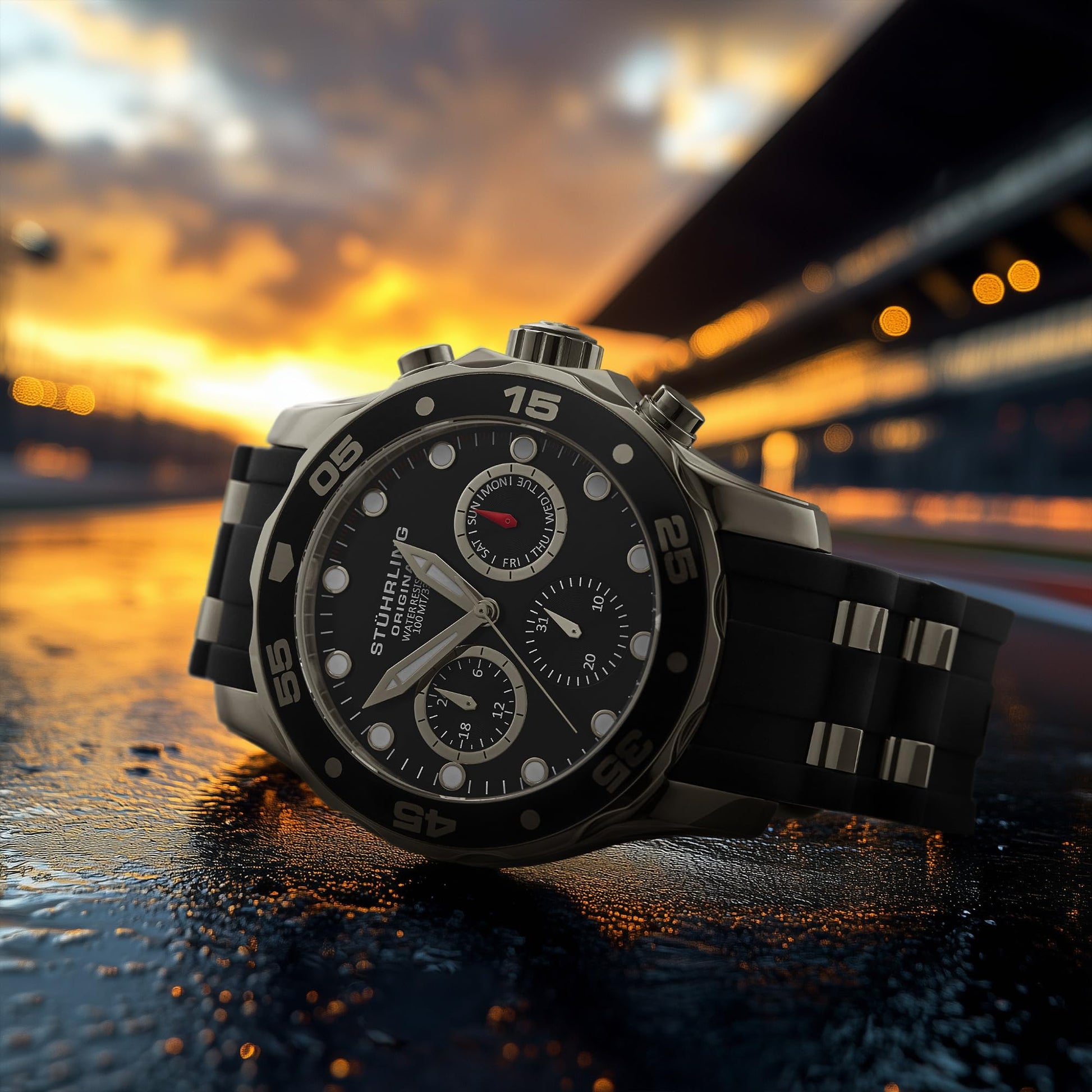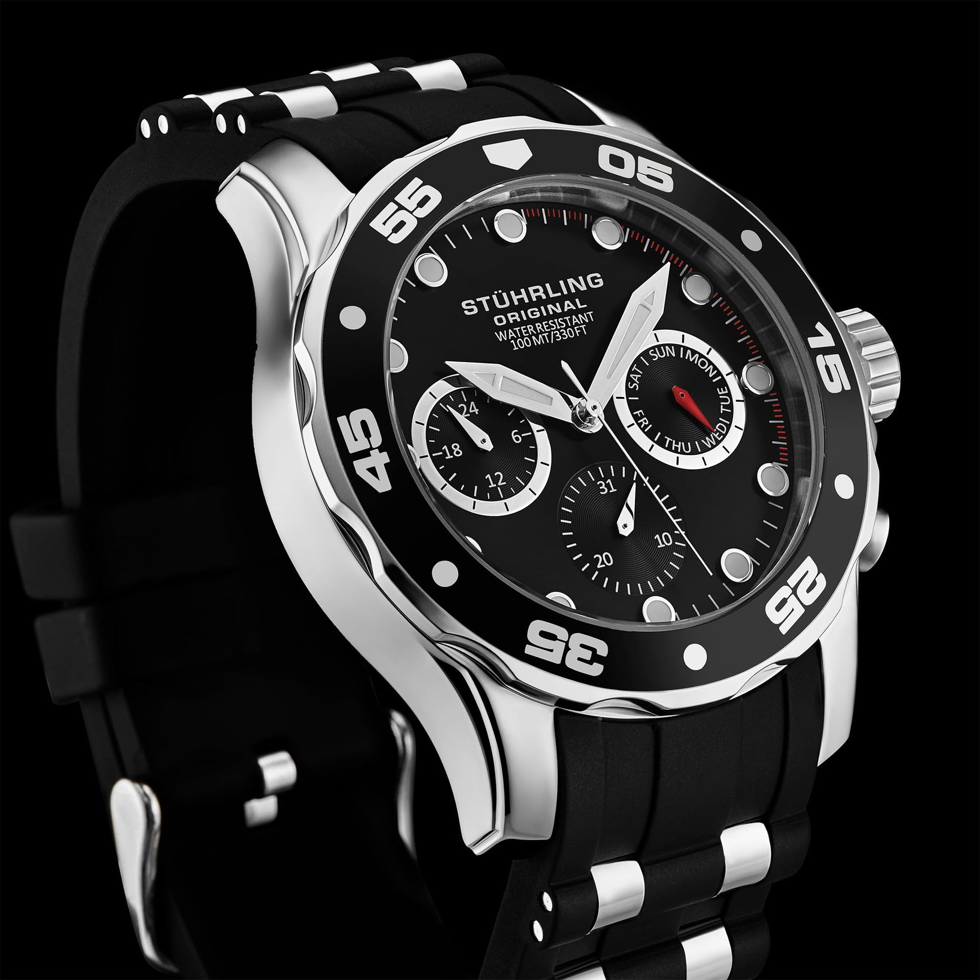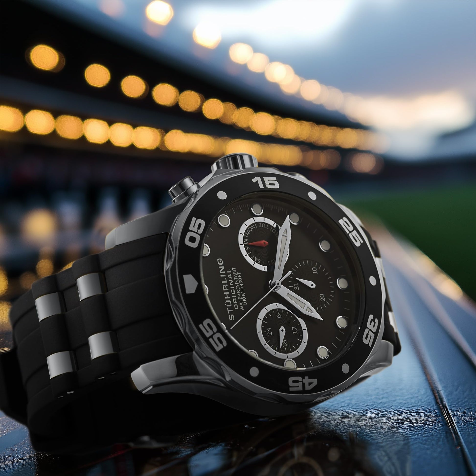 Stuhrling Men's Multi-Function Watch, 44mm Black Dial, Silver Case, Black Silicone Band