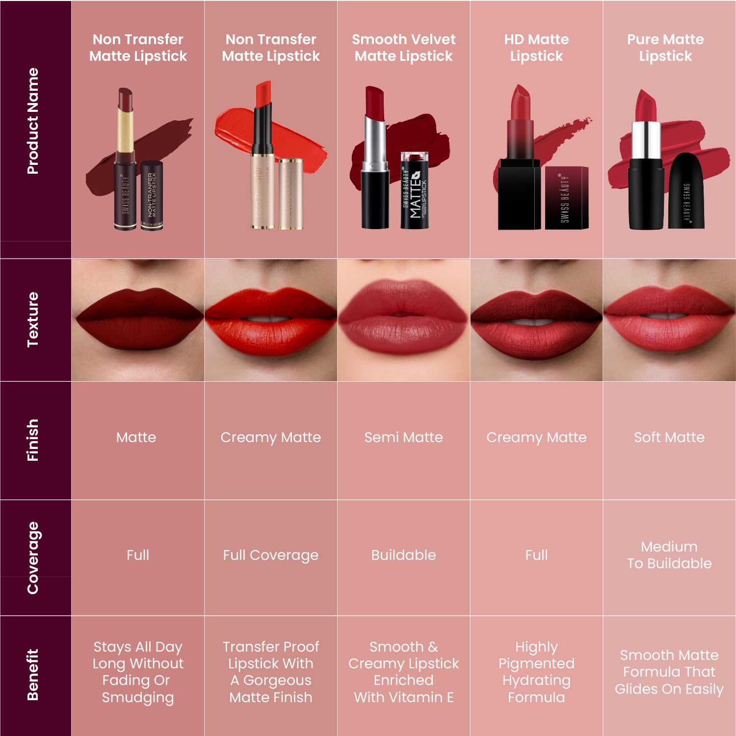 - Non Transfer Matte lipstick boasts a remarkable formula that pushes the boundaries of color intensity with its rich and intense pigment.