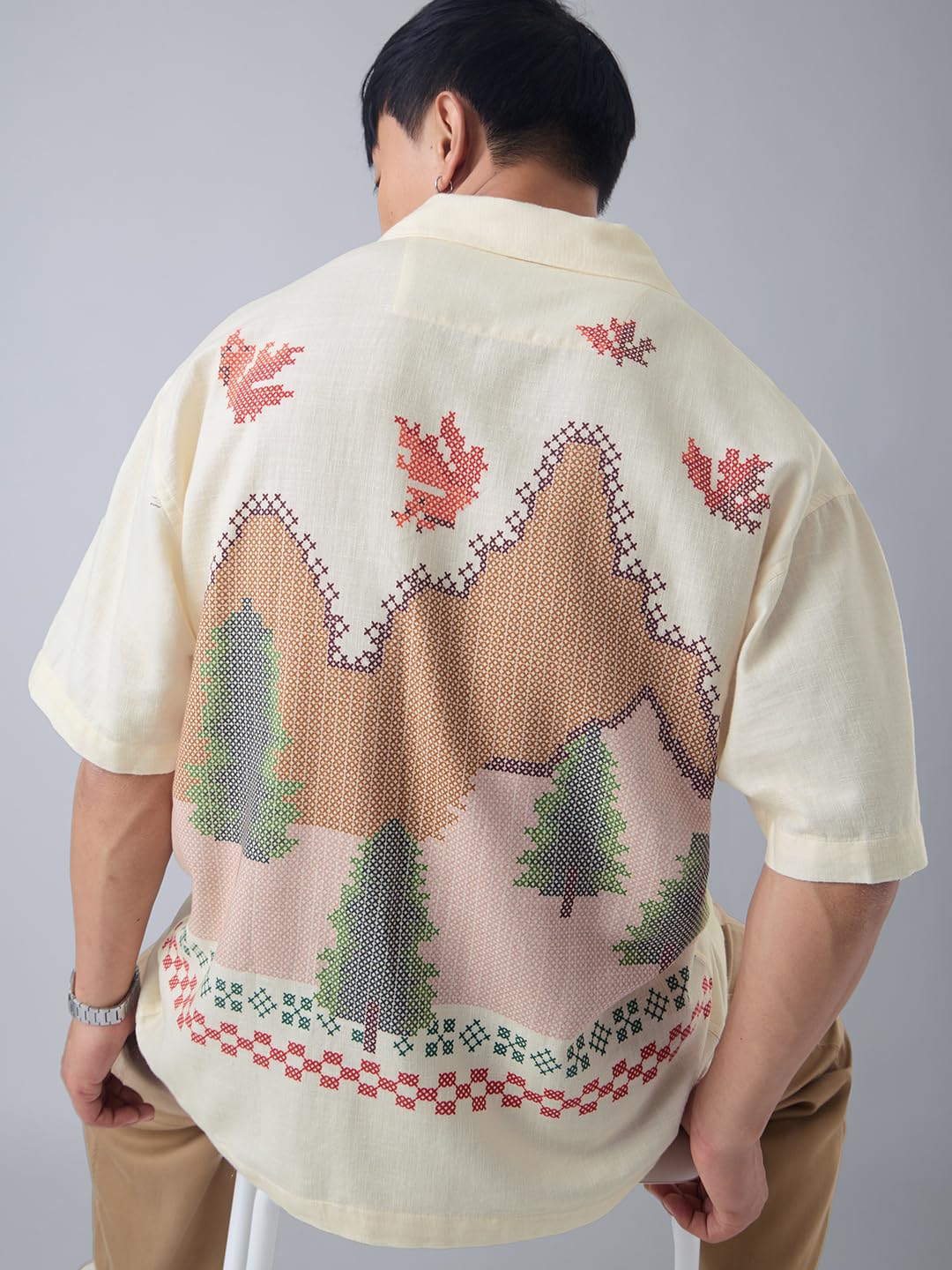 The Souled Store: Autumn Men and Boys Short Sleeve Cuban Collar Off White Printed Casual Drop Shoulder Streetwear Cotton Oversized Shirts