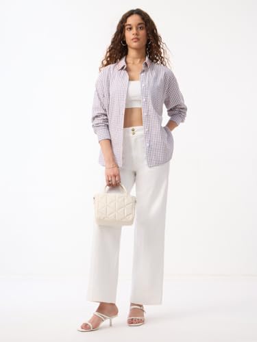 The Souled Store Citrus Bloom Women and Girls Full Sleeves Button Down Collar Light Blue Gingham Floral Embroidered Cotton Oversized Fit Lightweight Winter Shirt for Casual Wear
