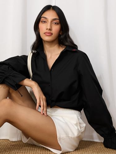 The Souled Store Hearts Women and Girls Long Sleeves Collared Neck Button Front Solid Black Regular Fit Cotton Shirts
