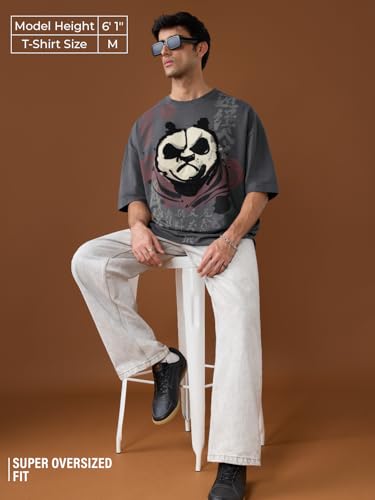 The Souled Store Kung Fu Panda: Angry Panda Men and Boys Short Sleeves Round Neck Grey Graphic Printed Embroidered Cotton Oversized T-Shirt