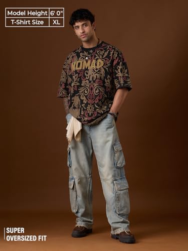 The Souled Store Nomad: Relic Men and Boys Short Sleeves Round Neck Black Printed and Embellished Comfortable Casual Streetwear Trendy Cotton Super Oversized T-Shirt