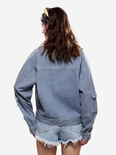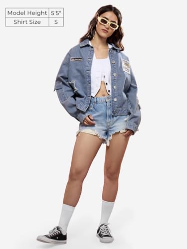 The Souled Store Official Pink Panther: Stay Pink Women and Girls Long Sleeves Collared Neck Button Front Embroidery Patch Blue Cotton Oversized Denim Jackets