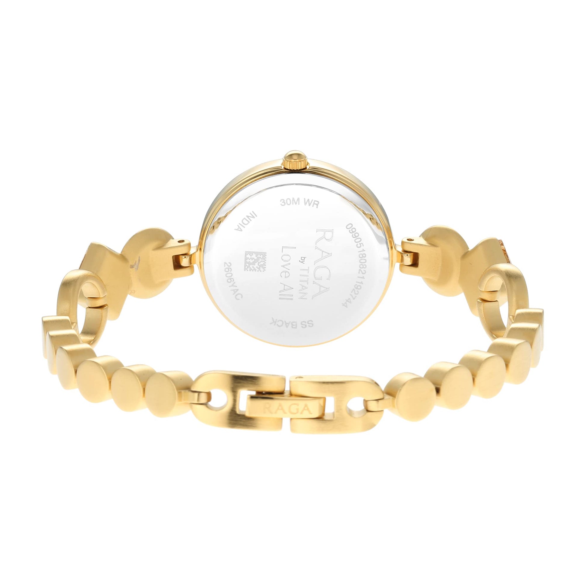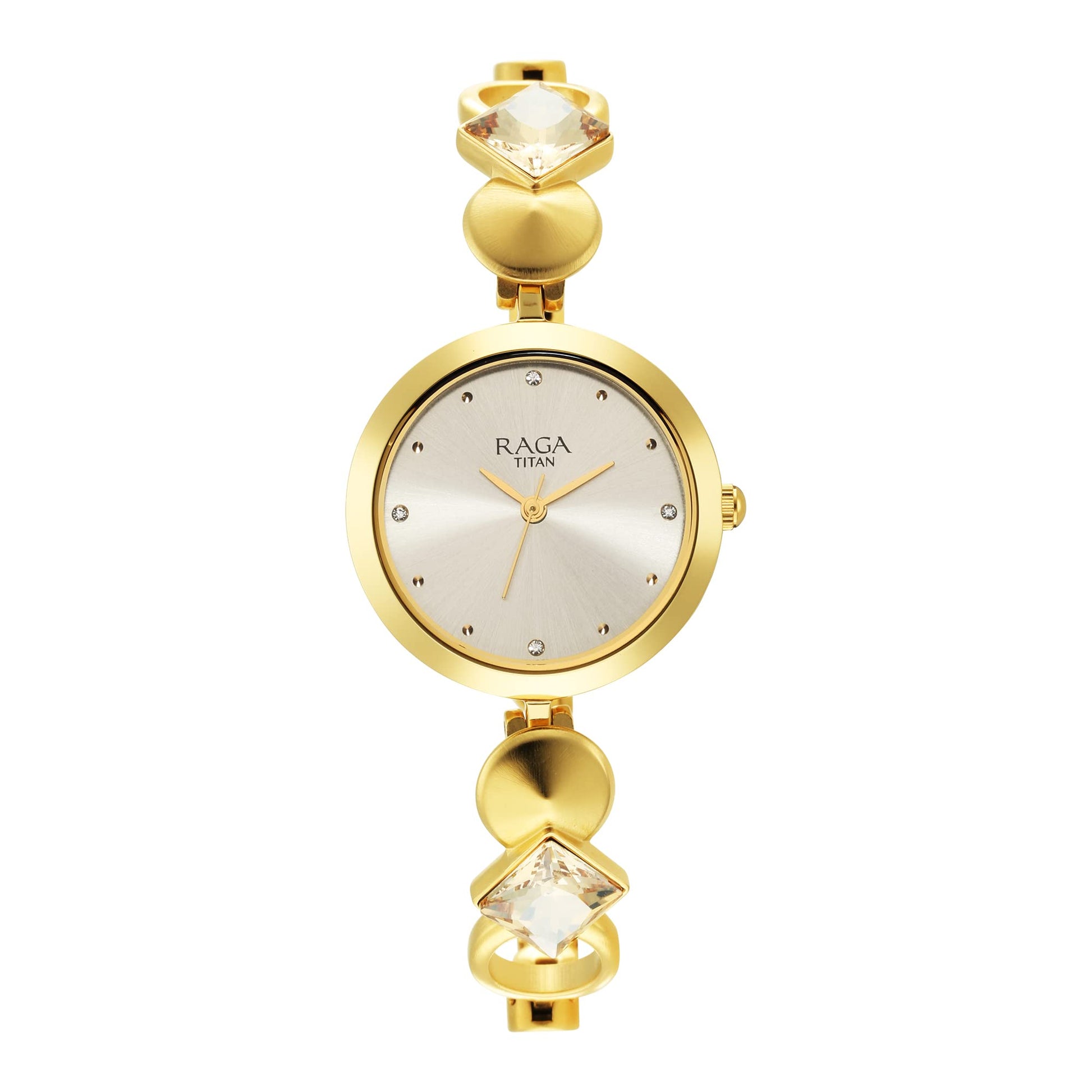 Details: Embodying grace with a touch of artistic flair, this Titan Raga Love All watch is a visual delight. The elegant silver sunray dial is encased in a radiant gold-toned case, and the hour markers are dotted with subtle crystal accents for a refined sparkle. What truly sets this piece apart is the uniquely sculpted bracelet strap - a fusion of smooth golden discs and dazzling crystal-inlaid links that elevate the watch into a jewelry-like statement. Ideal for women who love to blend fashion with function, this timepiece is a perfect companion for both festive occasions and elegant evenings out.