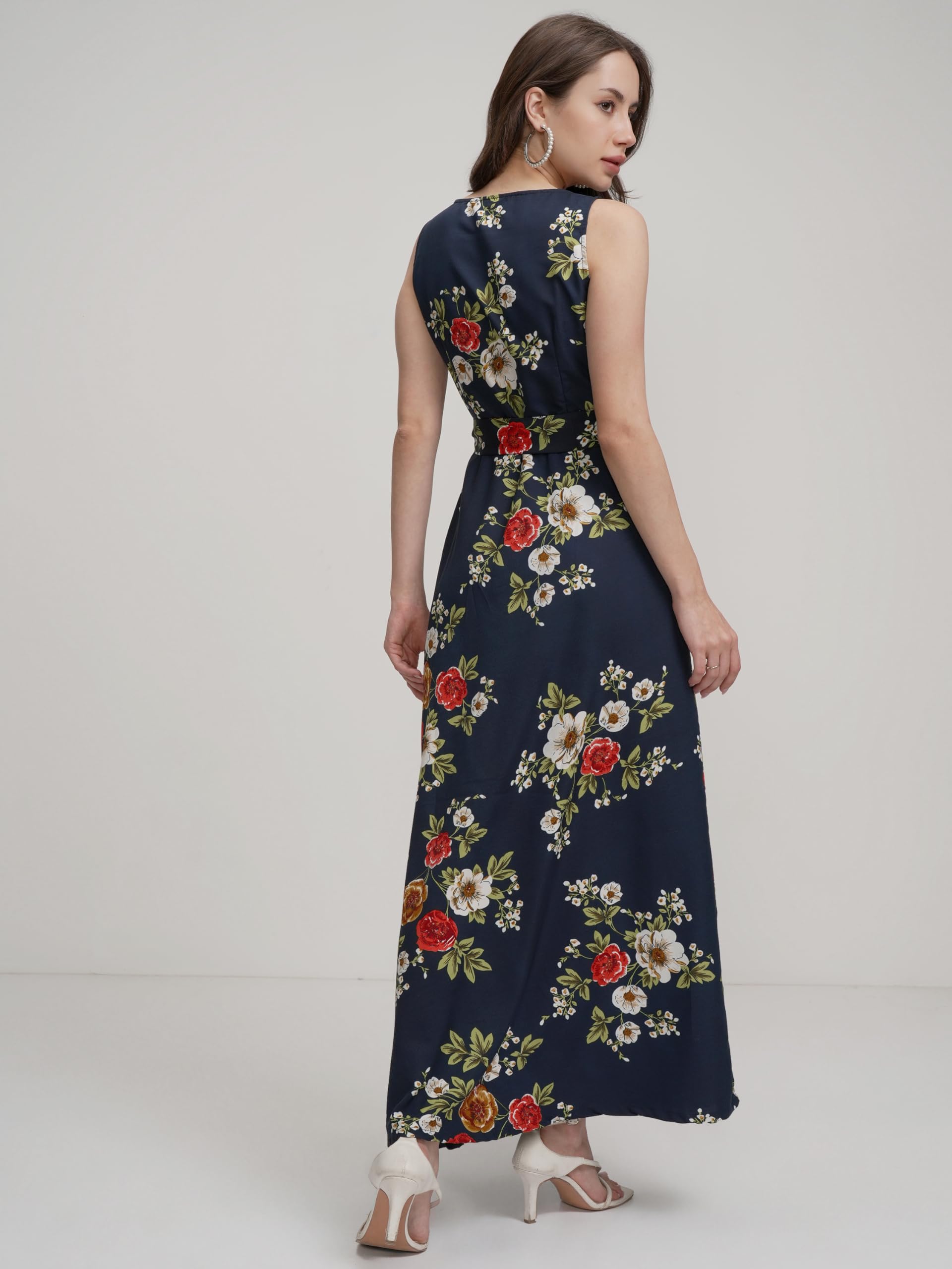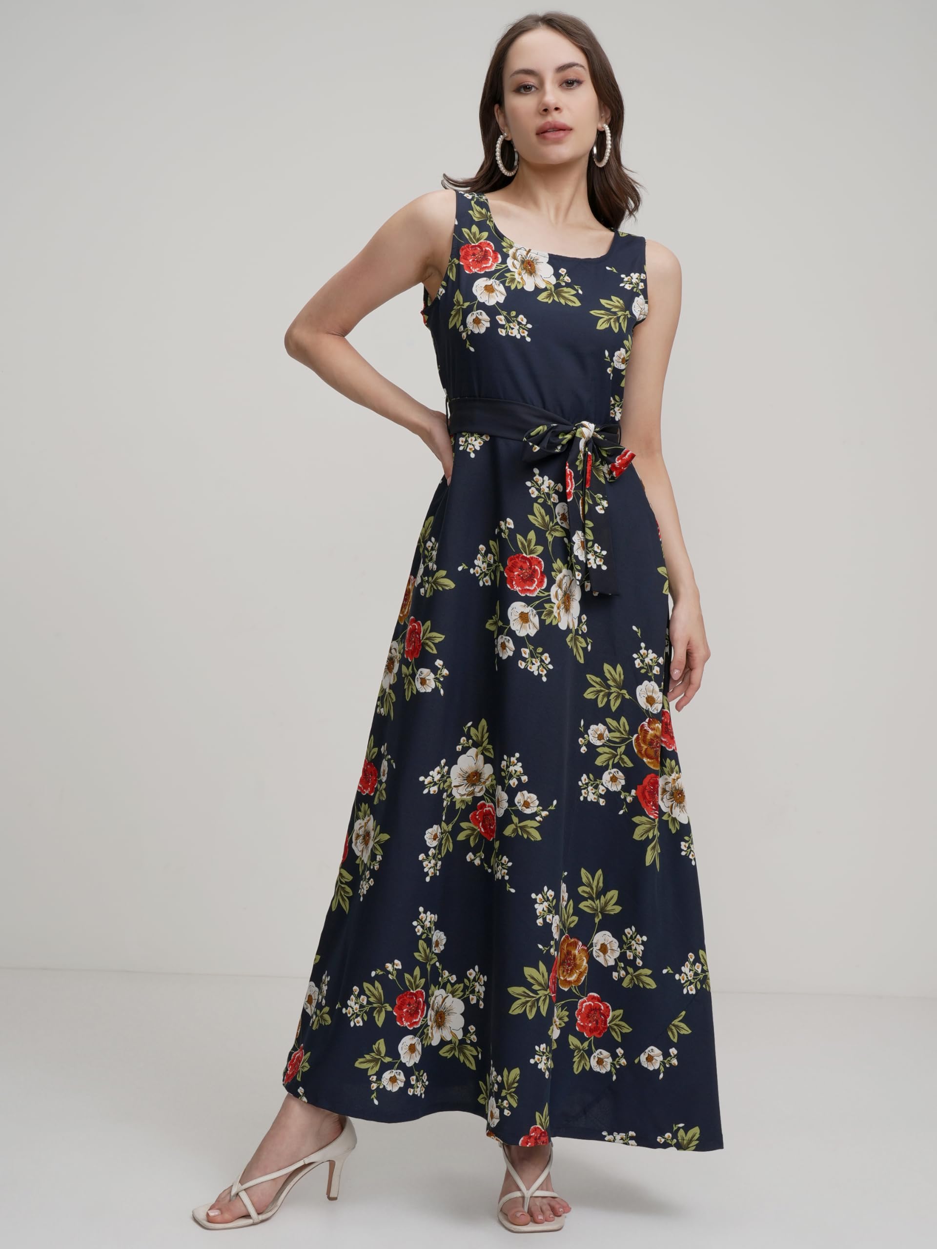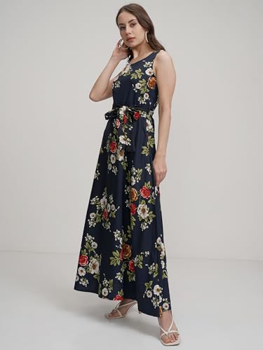 Tokyo Talkies Women Elegant Blue Printed Maxi Dress with Sleeveless Style–Perfect for Casual & Semi-Formal Occasions