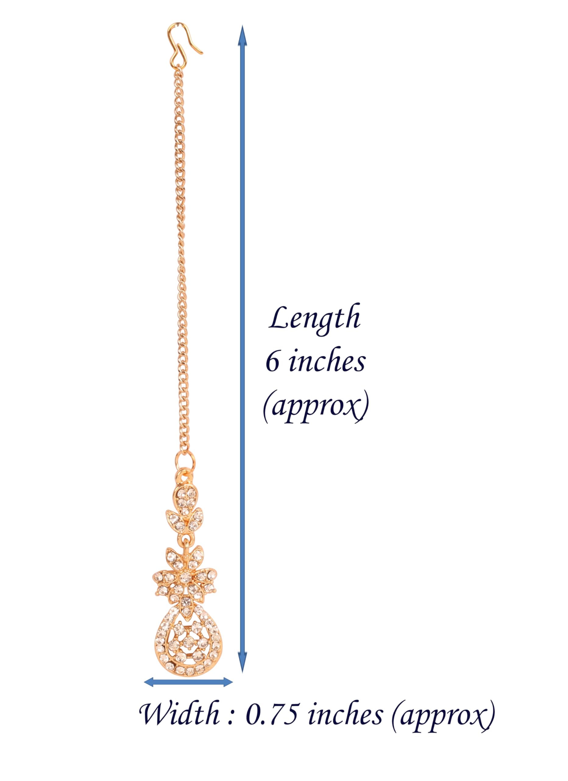 • NEW! Touchstone Indian Bollywood Exemplary Floral Filigree Rhinestone Designer Jewelry Mangtika Head Accessory In Antique Gold Tone For Women. SPECIFICATTIONS: Mangtika Weight 11 Gms. Length 6 Inches. Width 0.75 Inches.