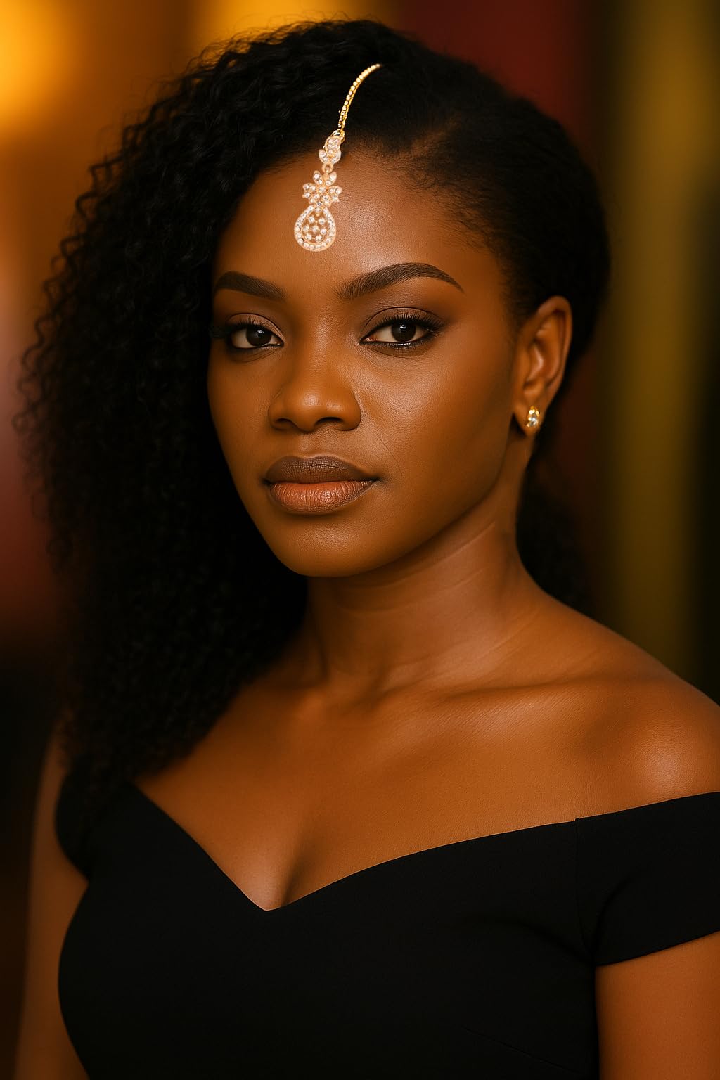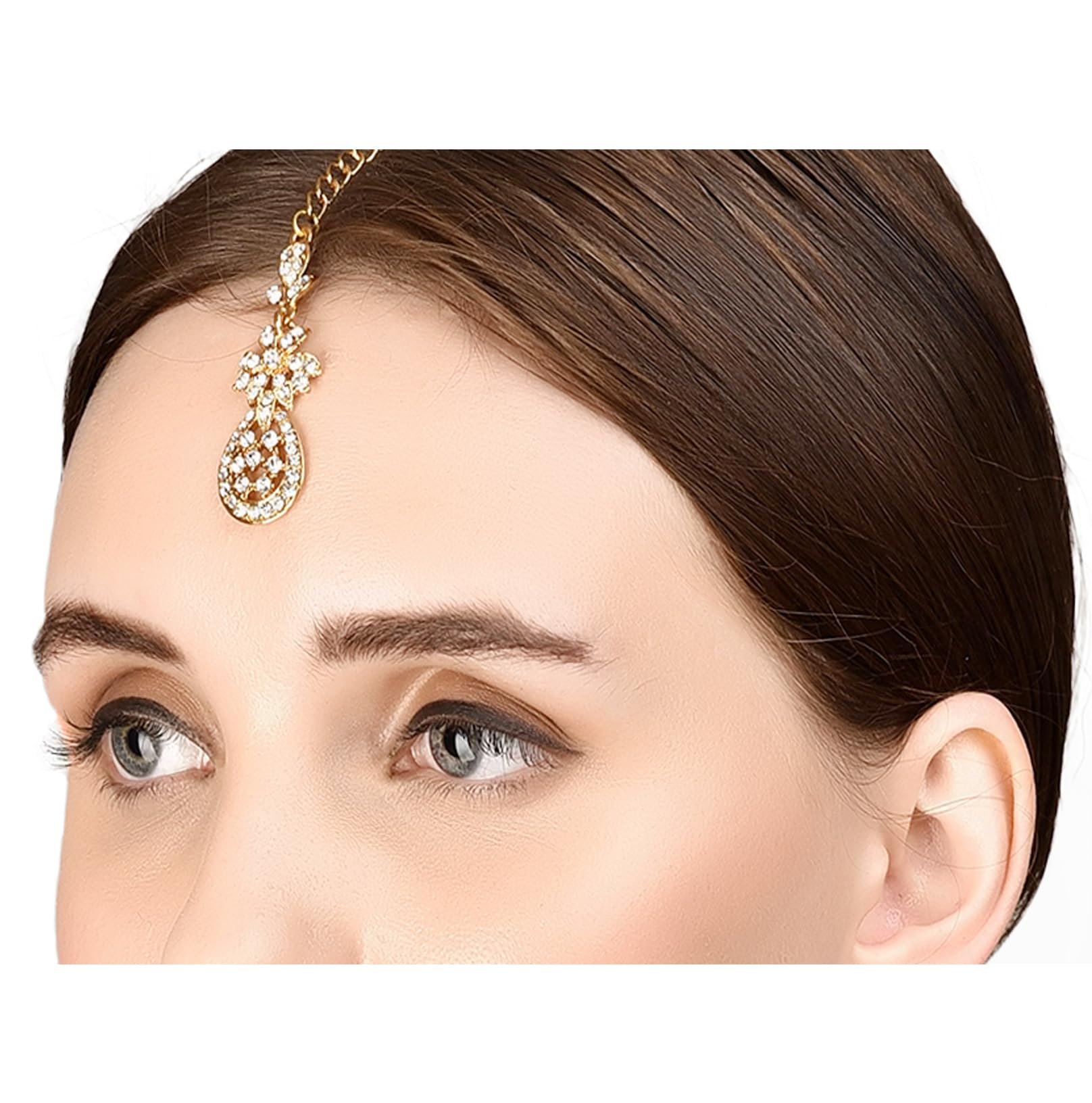 Alloy Metal, Exemplary Indian Handcrafted Floral Filigree Studded Diamond Look Sparkling Rhinestone Mangtika Head Accessory In Antique Gold Tone.