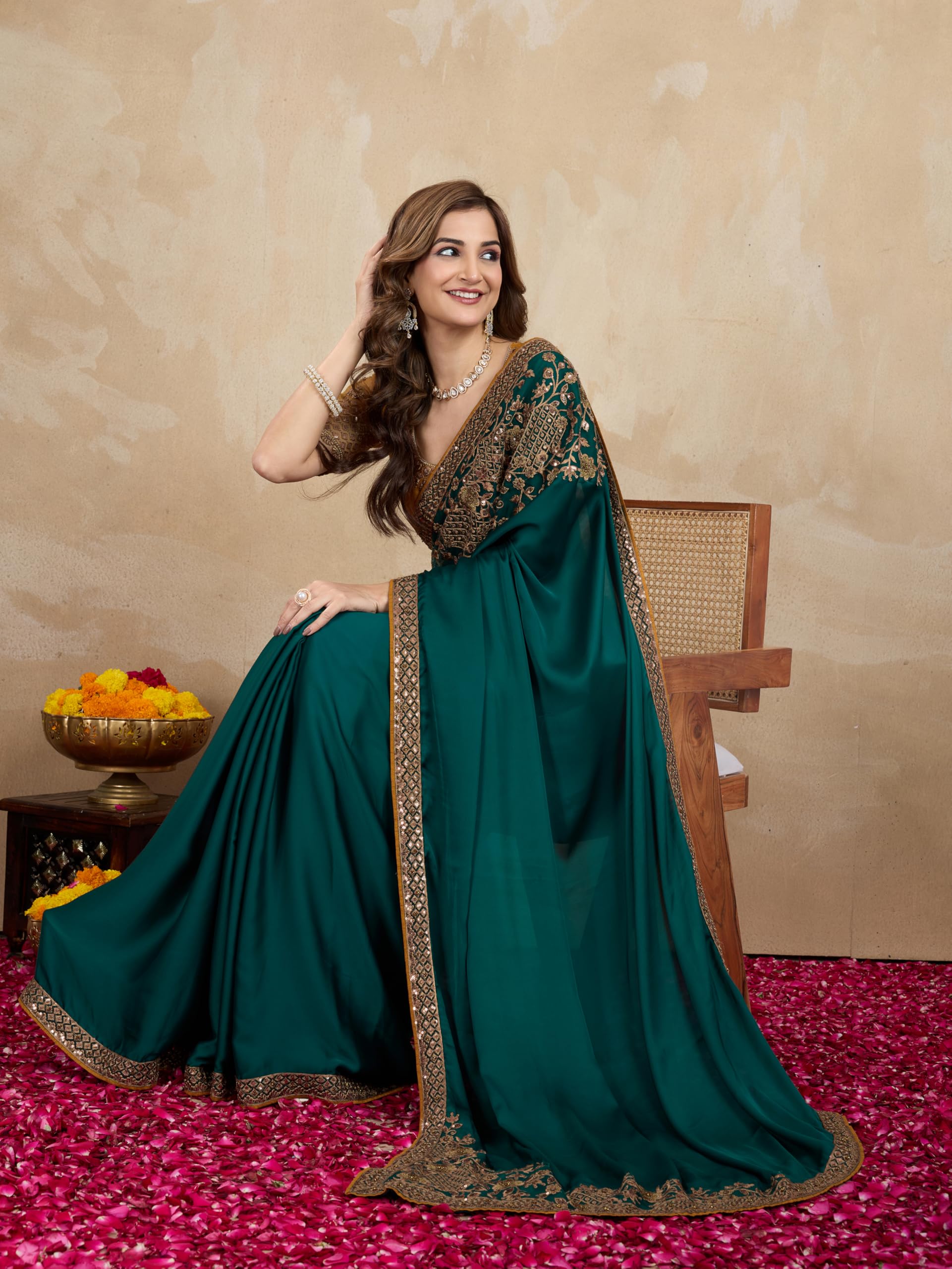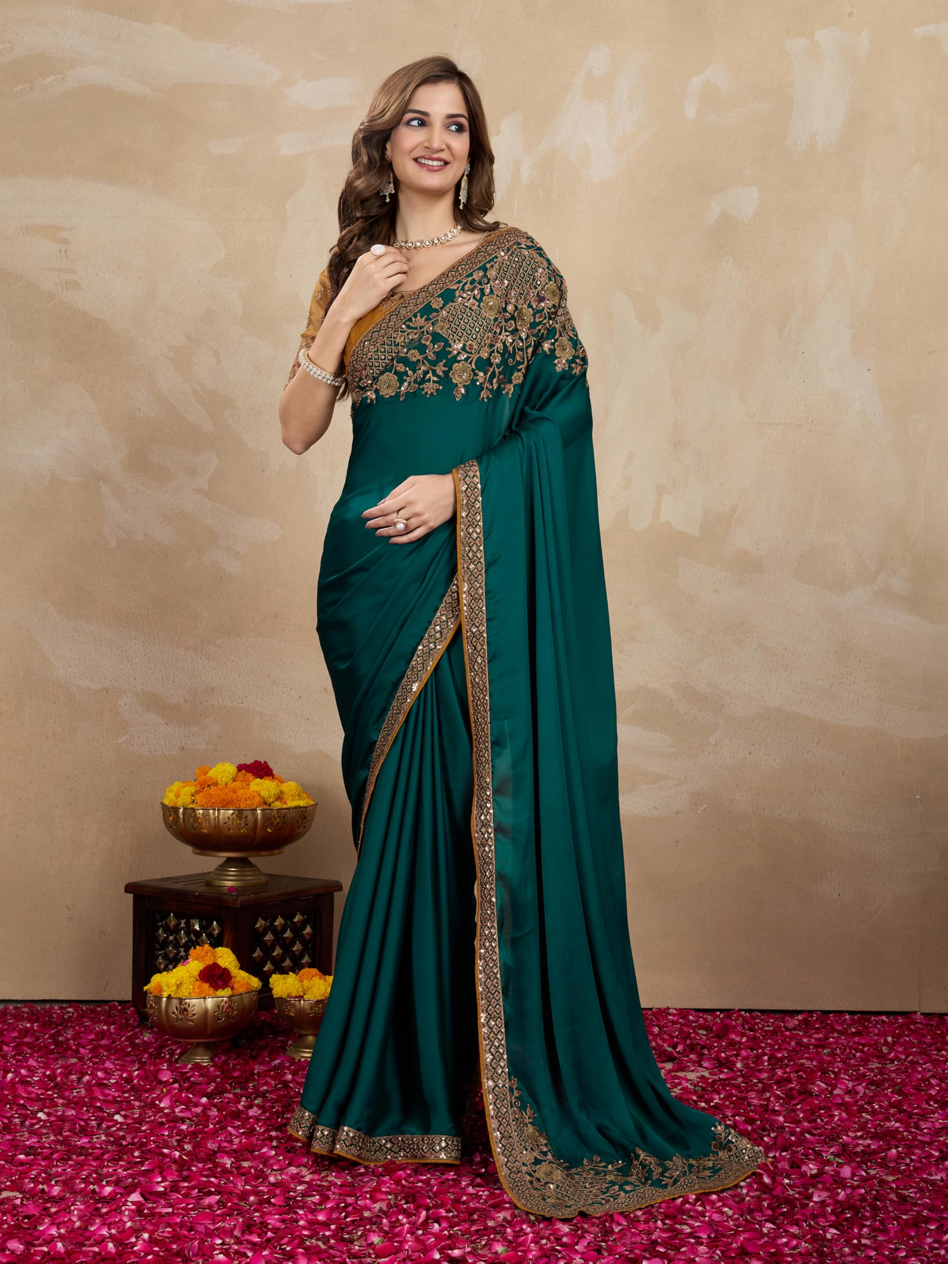 TRENDMALLS Women's Satin Golden Sequin Embroidery work Saree with Unstitched Blouse Piece (K1163-Green-)