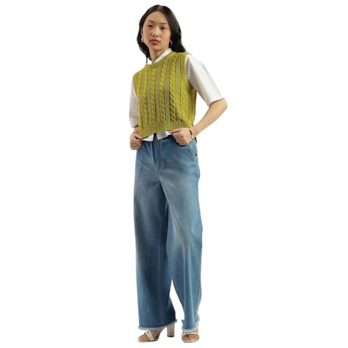United Colors of Benetton Round Neck Textured Cable Knit Sweater (Size: M)-25A1594D108YGL43 Green