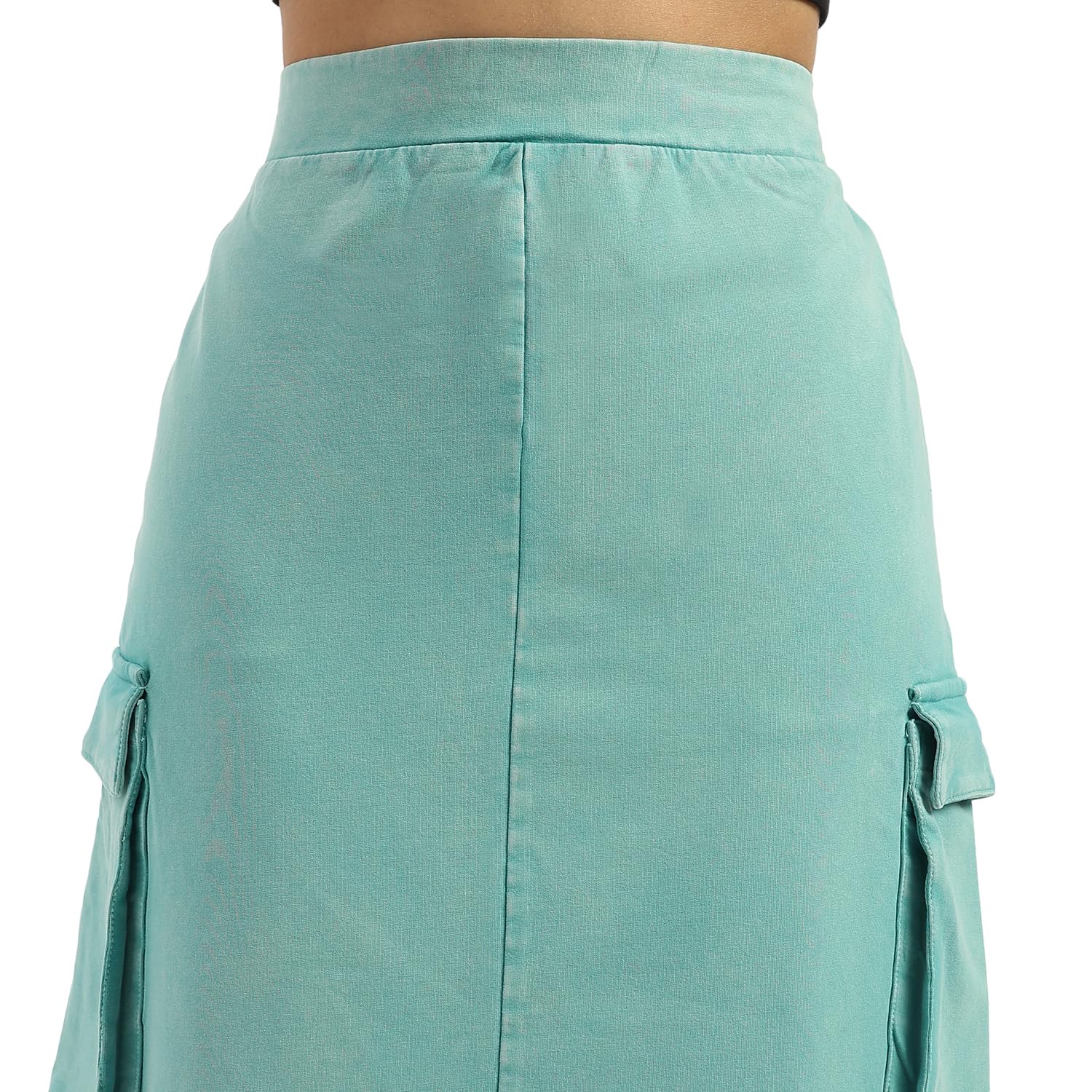 Discover effortless style with our Midi Cargo Skirt in blue. Featuring a solid pattern and high-rise design, this skirt offers comfort with its elastic closure. Made from soft cotton lycra fabric, it ensures a perfect fit for women. Ideal for casual outings or a chic office look, elevate your wardrobe today.