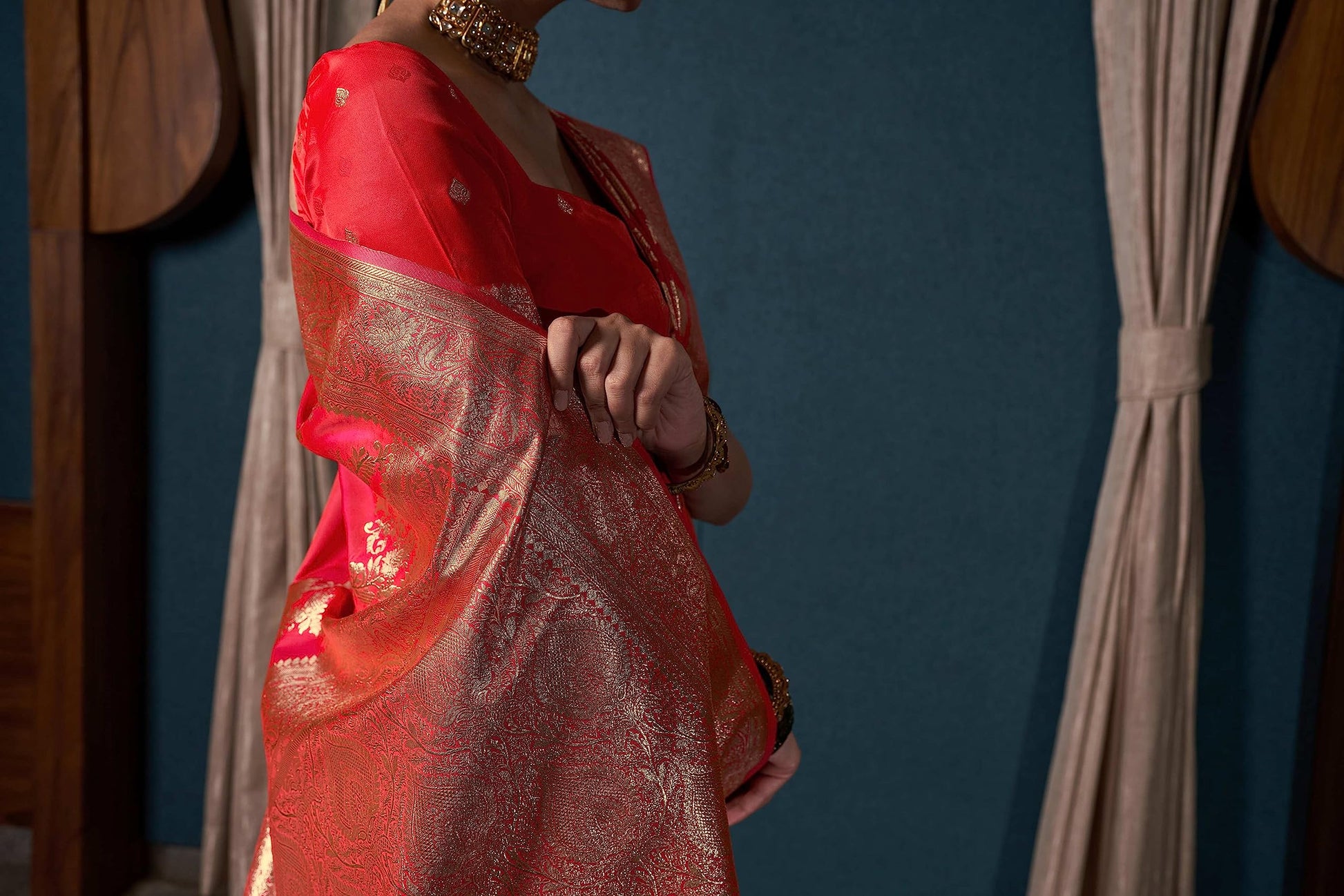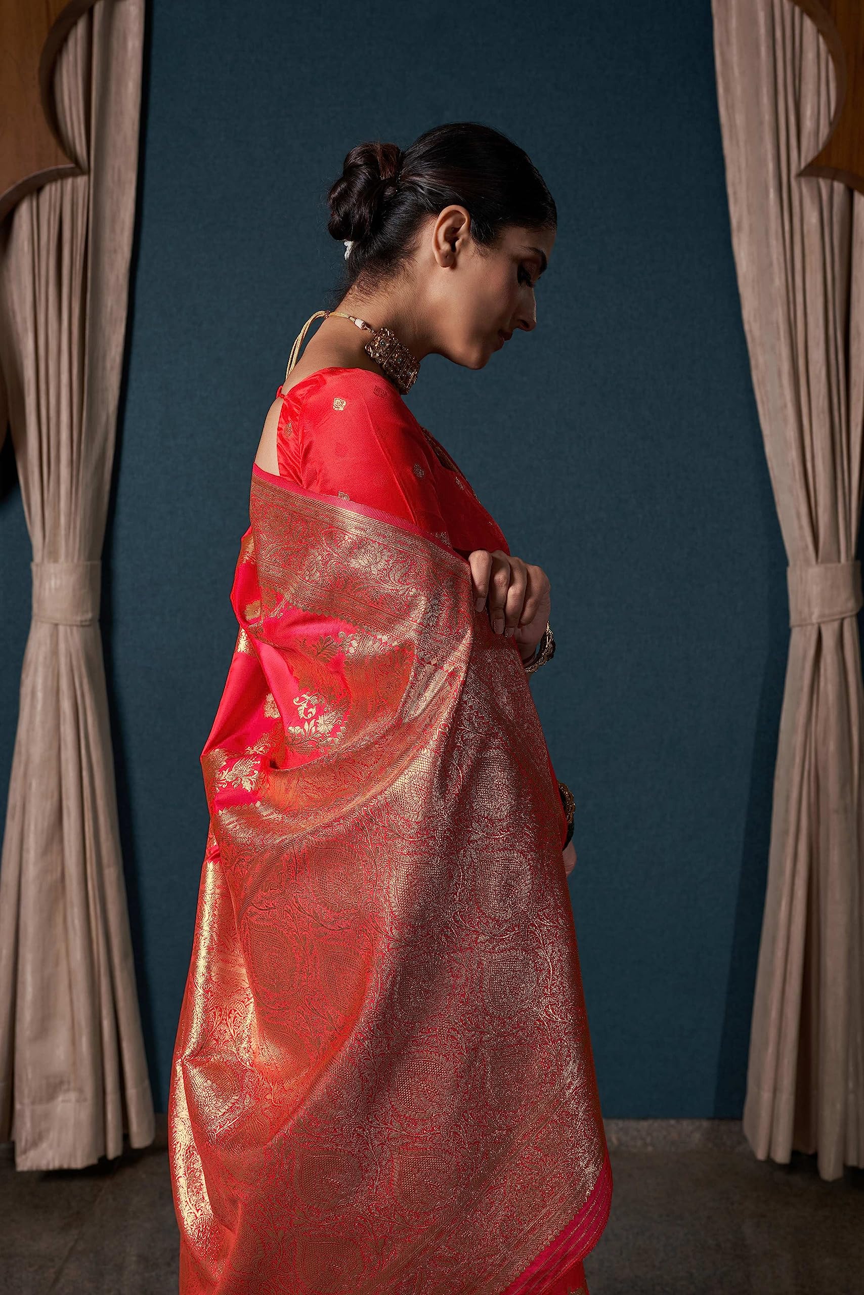 Vardha Women's Banarasi Satin Silk Saree with Blouse Piece, Zari Woven Pink Sari Vishika, 699