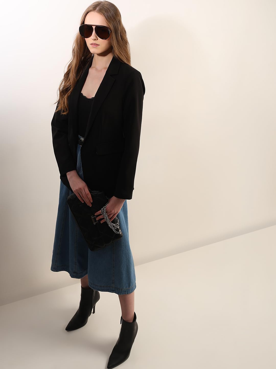 Introducing our versatile black blazer, designed to add a touch of sophistication to any wardrobe. With full sleeves and a solid black colour, this blazer is both timeless and elegant. The notched lapel and below-hip length offer a flattering silhouette, while the absence of closure ensures a sleek, streamlined look. Featuring two practical pockets with flaps and a regular fit, this blazer seamlessly combines style and functionality. Perfect for elevating both casual and formal outfits, it's a must-have addition to your collection.