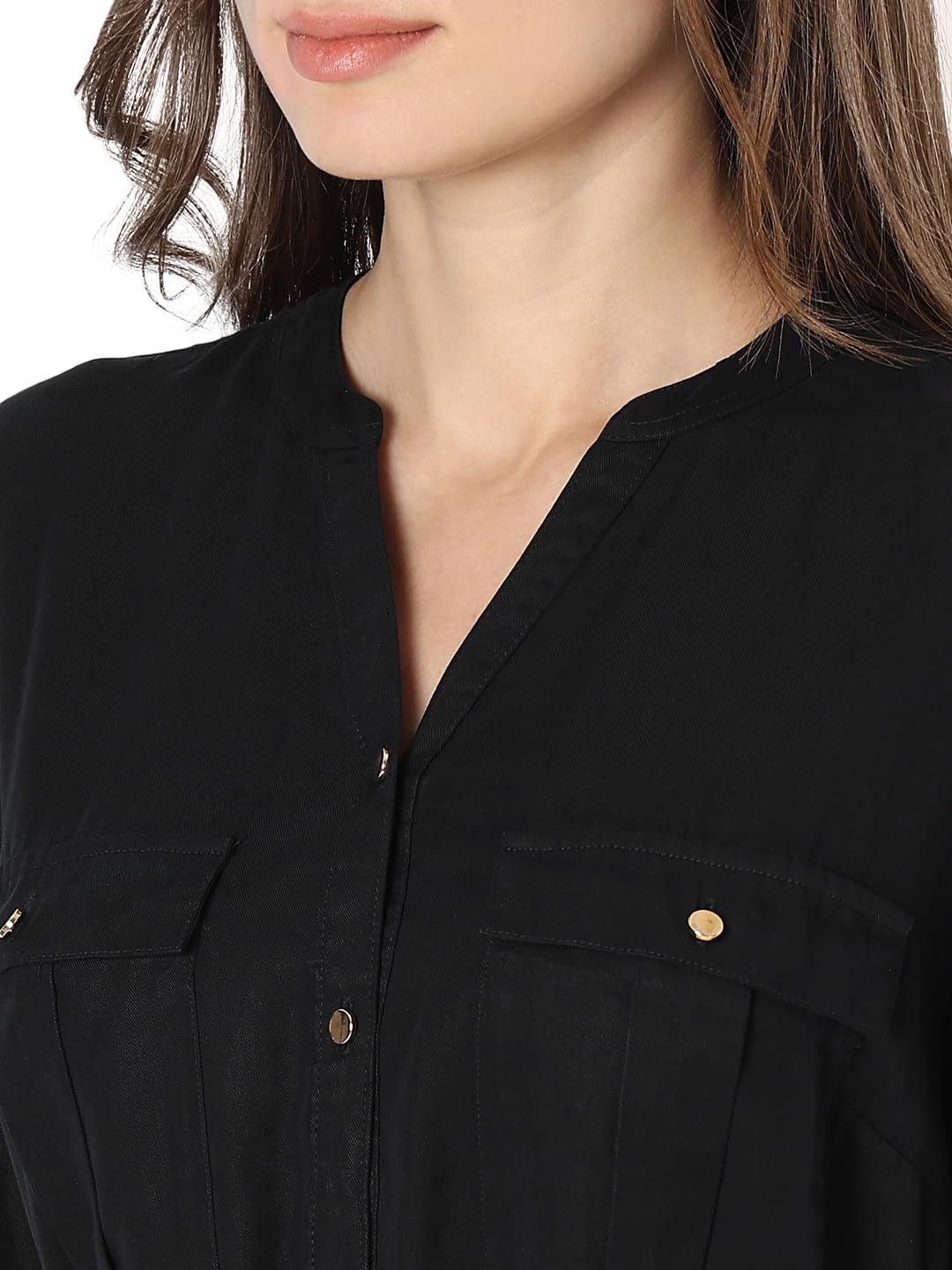 Introducing our solid black utility shirt dress for women, a versatile piece that seamlessly blends style and functionality. This dress features a mandarin collar and full sleeves with roll-up tabs, exuding a classic yet contemporary vibe. The front button placket and chest patch pocket with flap add subtle detailing, while the fabric belt cinches at the waist for a flattering silhouette. Falling below the knee, this dress strikes the perfect balance between sophistication and ease.