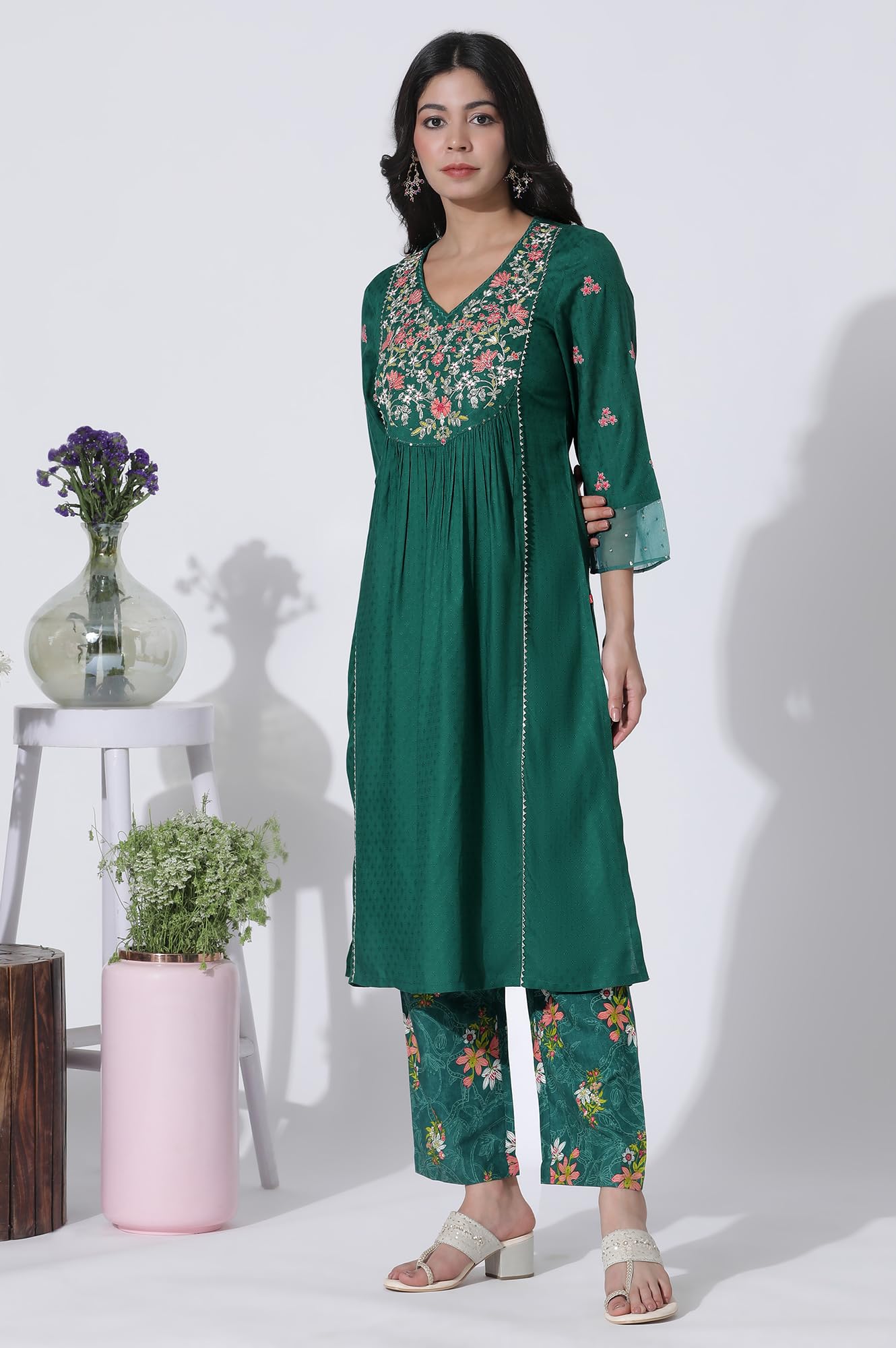 Emerald Green Kurta Crafted In Viscose Dobby Fabric In A Panelled Silhouette. The Kurta Features A Vibrant Floral Embroidered Yoke Along With Gota Trim Details. It Is Paired With Printed Chanderi Drape And Straight Printed Bottom.