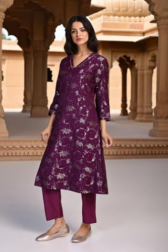 - PRODUCT DESCRIPTION: Radiating elegance in a rich purple hue, this floral jacquard kurta set features an A-line silhouette paired with straight pants and a lightweight organza dupatta. The intricate floral patterns and striped dupatta detailing make it a standout choice for festive and traditional occasions.