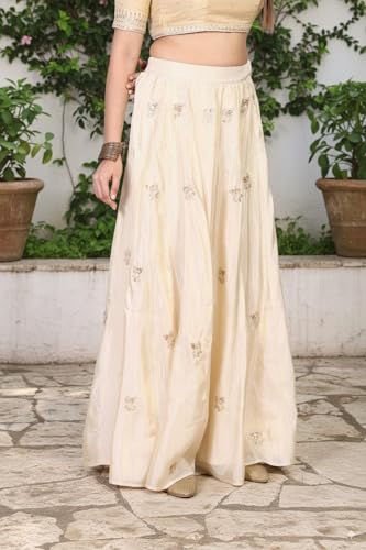 - STYLE SUGGESTION: Pair this off-white flared skirt with a statement crop top and bold jewelry for a festive look. For a casual vibe, opt for a simple blouse and flats. Add a clutch or potli bag to complete the ensemble. Layer with a shawl or jacket during cooler evenings for added flair.