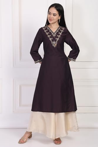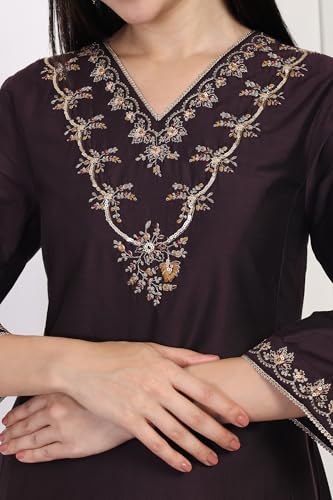 - PRODUCT DESCRIPTION: Bathed in a rich Wine Shadow tone, this flared kurta offers a sophisticated modern ethnic look. The solid design is masterfully contrasted with intricate floral embroidery, highlighted with metallic Zari accents around the V-neck and three-quarter sleeve cuffs.