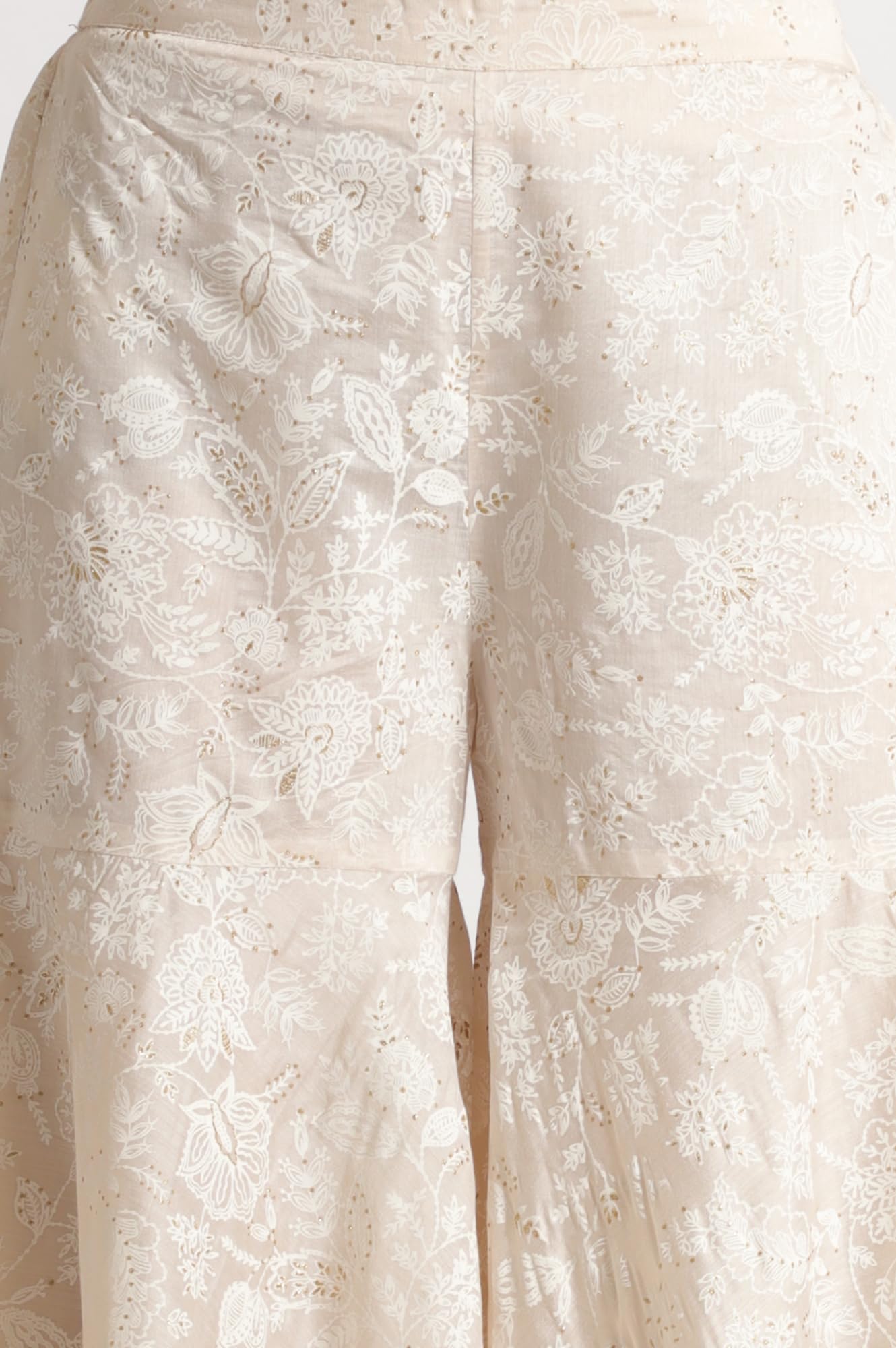 Step into timeless grace with this white chanderi flared short kurta and sharara set. Crafted from luxurious Chanderi fabric, the short flared kurta features an elegant print that adds a touch of sophistication. The matching sharara provides a flowing silhouette for comfort and style, while the sheer dupatta completes the ensemble with delicate charm. Ideal for festive celebrations, this set blends traditional craftsmanship with contemporary elegance.