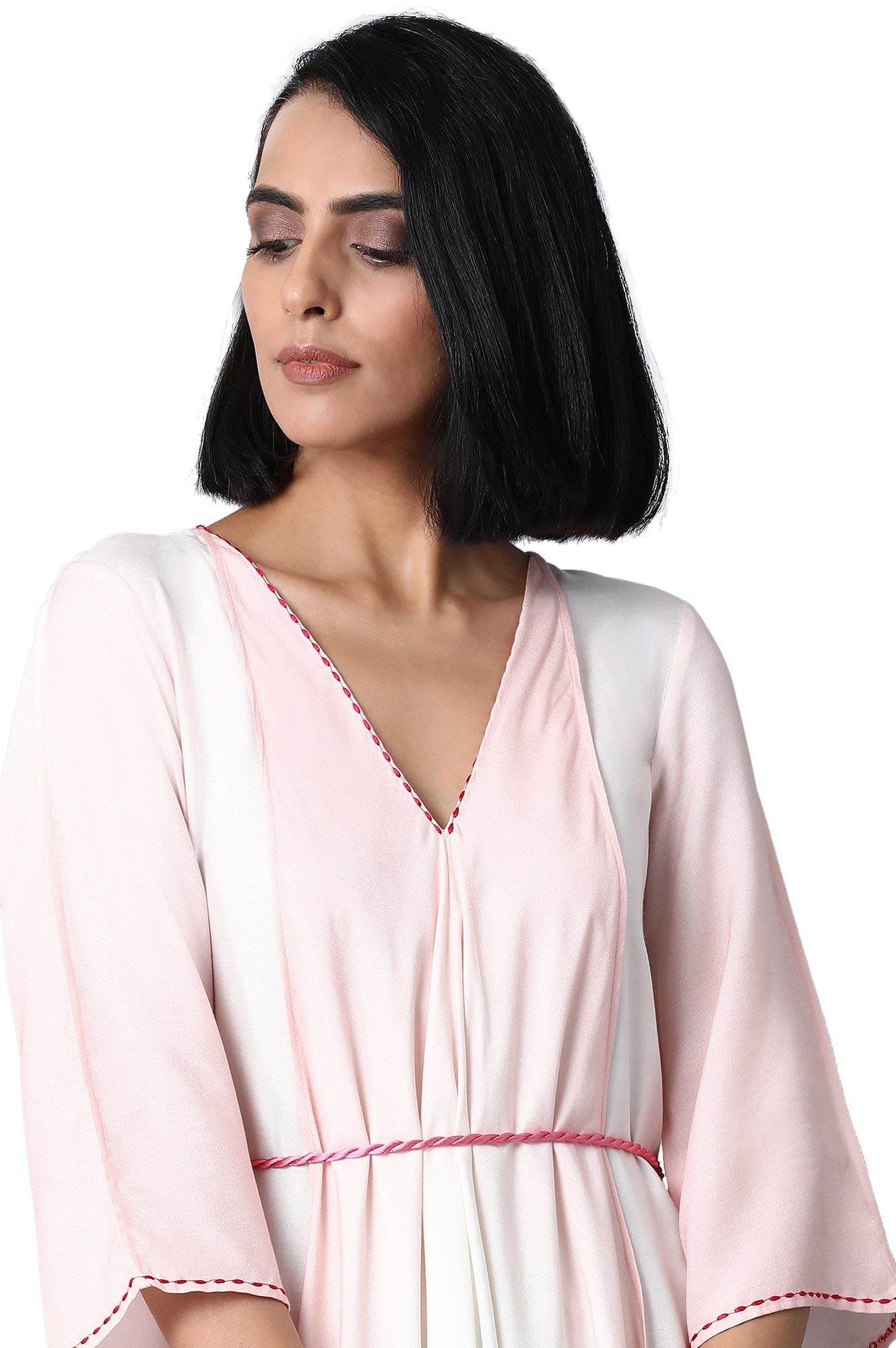 Pink and ecru color blocked asymetric dress in round neck and three-qaurter sleeves.