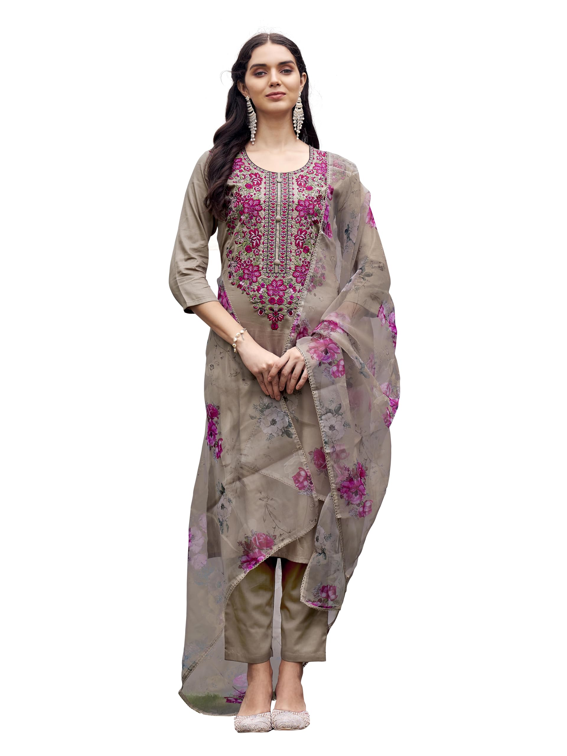 Womanista Women's Beige Color Cotton Blend Multi Embroidered Kurta Set With Printed Organza Dupatta(Kurtaset_1340_XL)