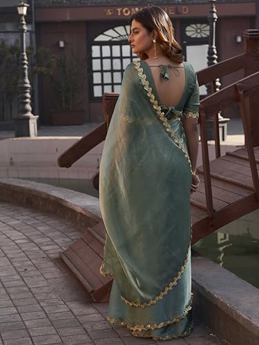 Womanista Women's Two toned jimmy choo saree with brocade blouse and embroidered lace(TI6867_olive green_Onesize)